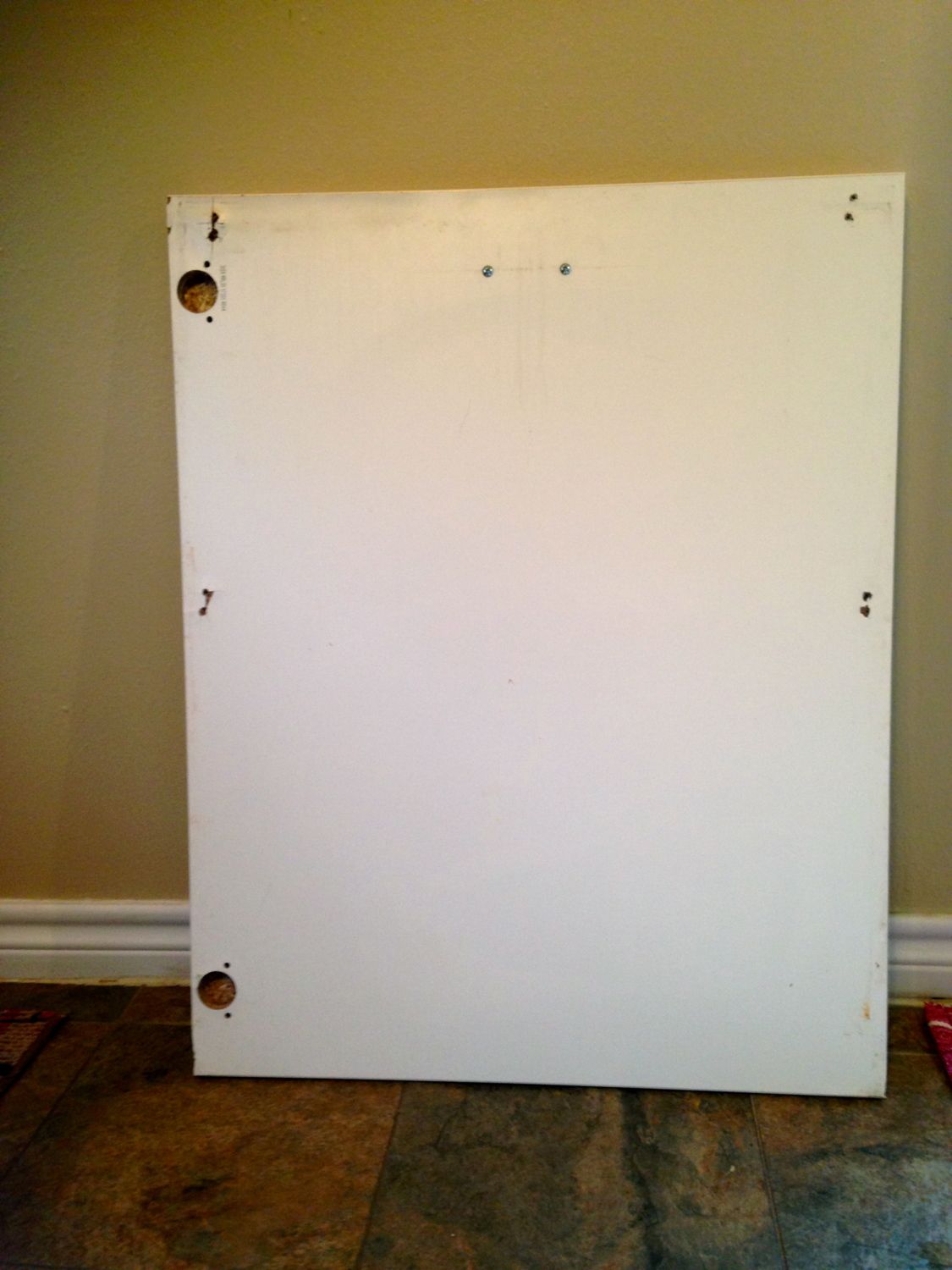 Back of panel. The big holes are for hinges of it was used as cabinet door. I'm not sure why there are double sets of holes for the 4 screws. I guess the not so handy DIY'er that installed it goofed on the first try.