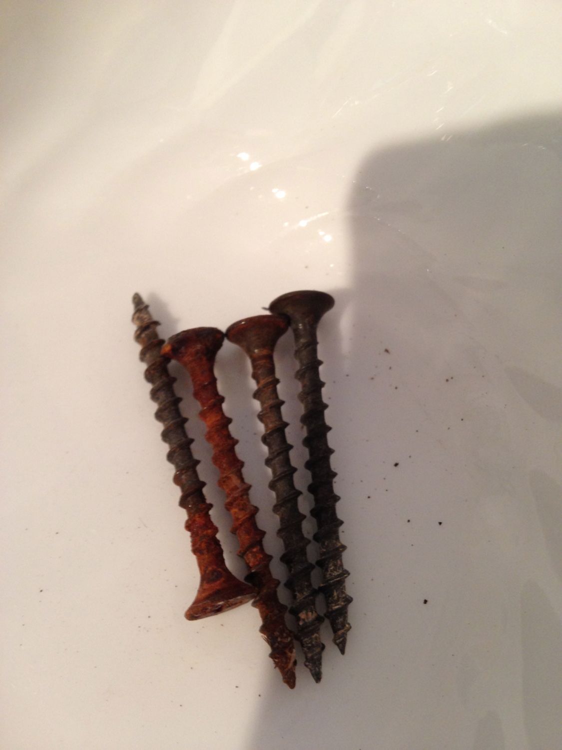 The screws. They aren't stripped. The 'wood' is. They are a little rusty though due to leaking going on through them to the outside of the dishwasher... I'm really at a loss as to how to fully and properly fix this. I know I can glue the screws back in, or glue a dowel into the hole to make fresh wood for a new hole, but that doesn't solve the leaking which caused this to happen in the first place. Unless the loose screws caused to to leak....