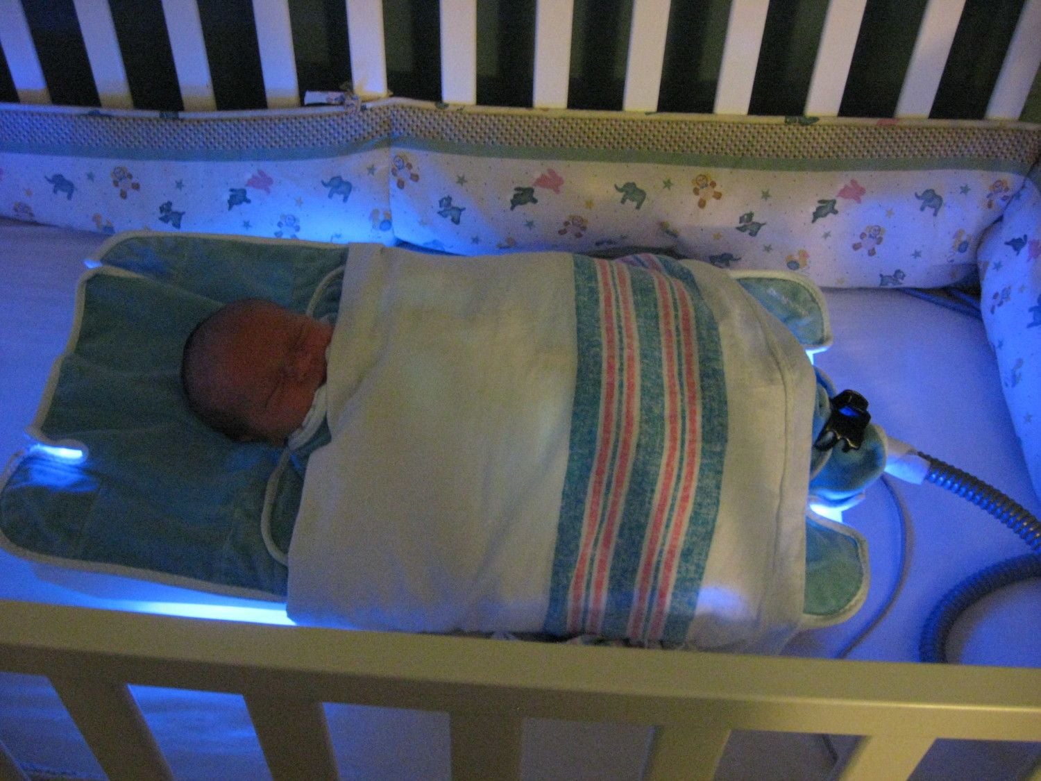 This is a Bilibed. She's basically sandwiched between two light sources, kept down in a fleece cover that velcros around her.. diaper only, which is why the blankets go over the top. She can only be removed for feedings