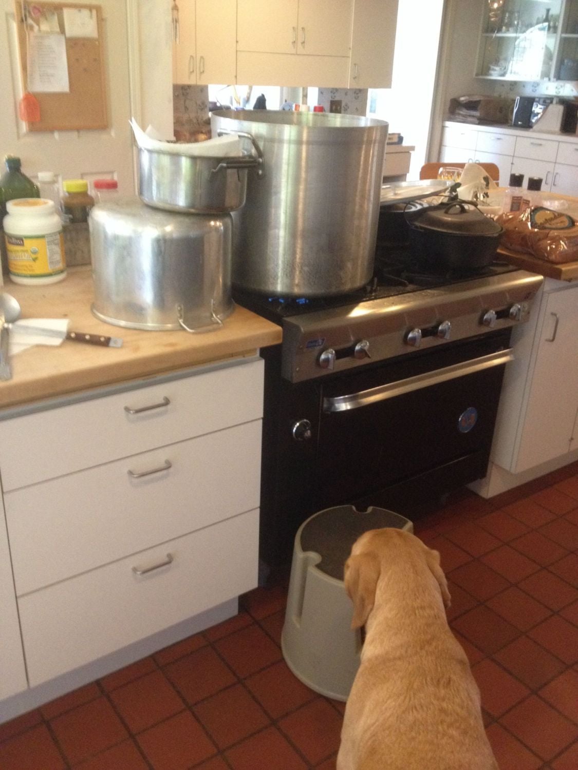 Step stool, Labrador, stack of smaller pots ... I'm getting a turkey steam facial.