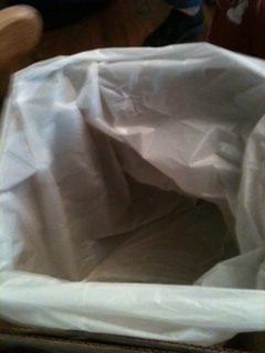 3* I then added a 13 gallon, white plastic trash bag to line the box. This will not be closed up and I will explain why I added it later.