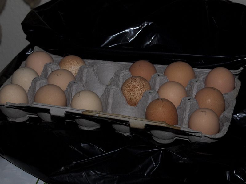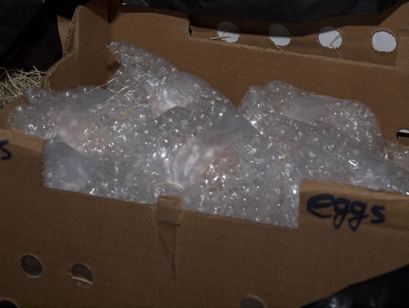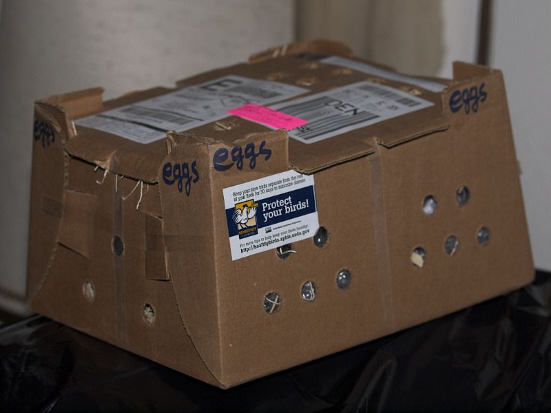 I just received guinea hatching eggs from Country Hatchery and they were packed in a live bird box. They were clearly marked as eggs. I don't have much luck determining detached air cells in guinea but to the best of my ability, it appears as if there is only one egg with a detached air cell. The eggs will go into the incubator later today as I just received them at 7 AM MDT this morning.