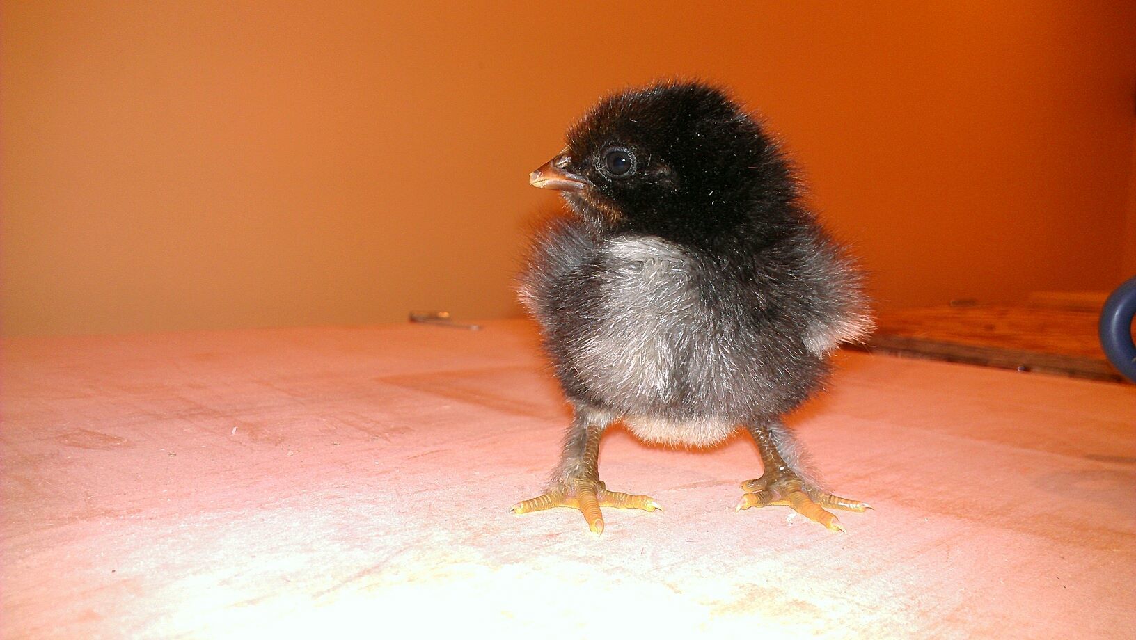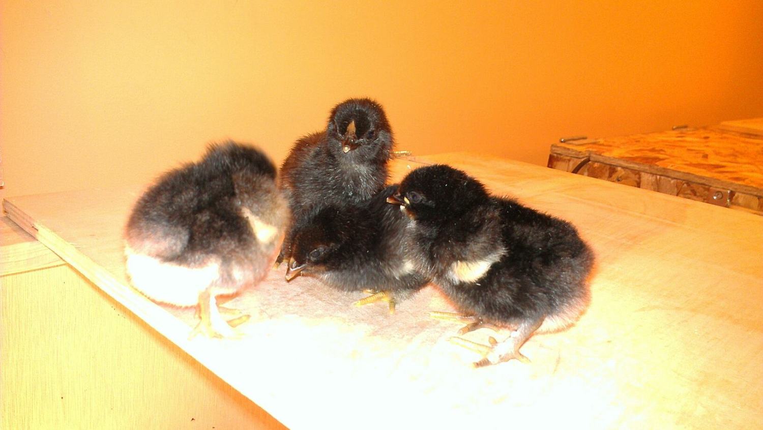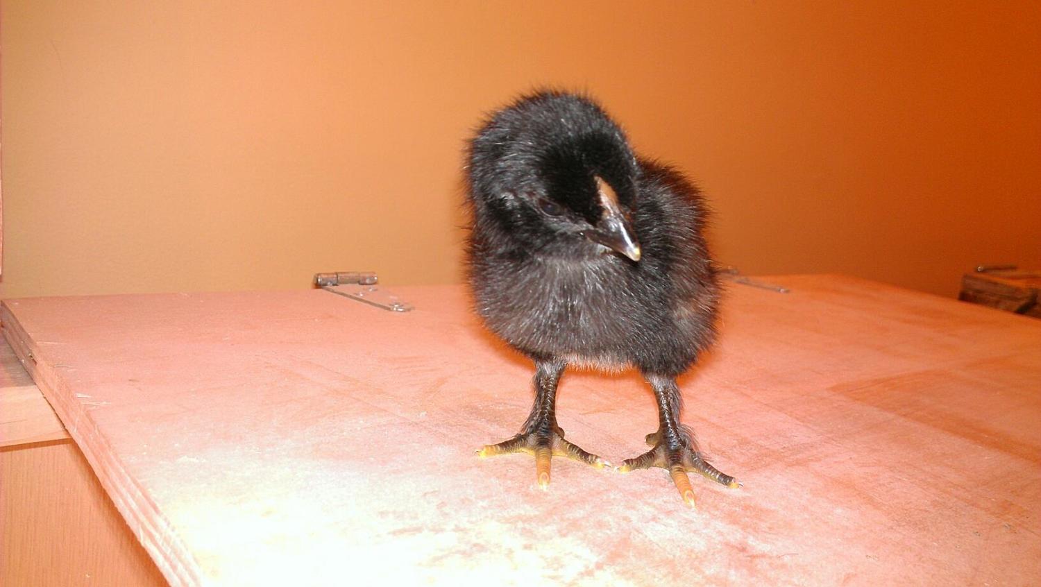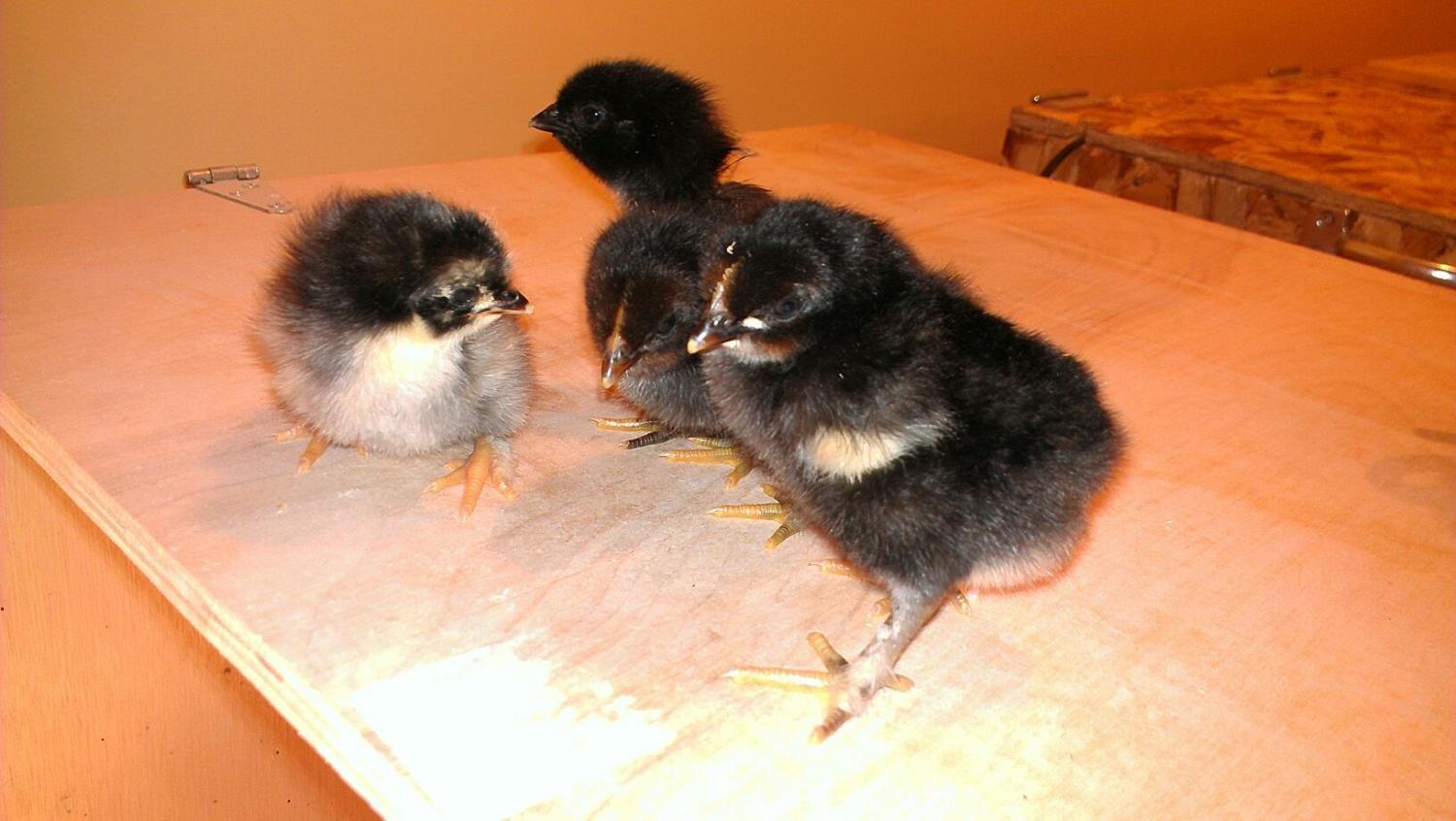 I can/t wait to see what that black and silver one with the silver chaps looks like! Ron had a silver/blue chick, too and I think those must be out of a half blue EE hen I have and the BCM ROO. The yellows should be out of one of two white EEs which are two of my most Aneracauna looking EEs. I will call the chipmunk one 'Asland.'.