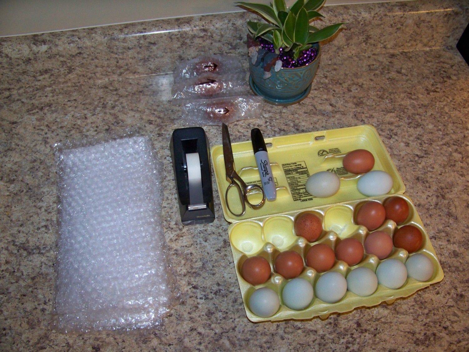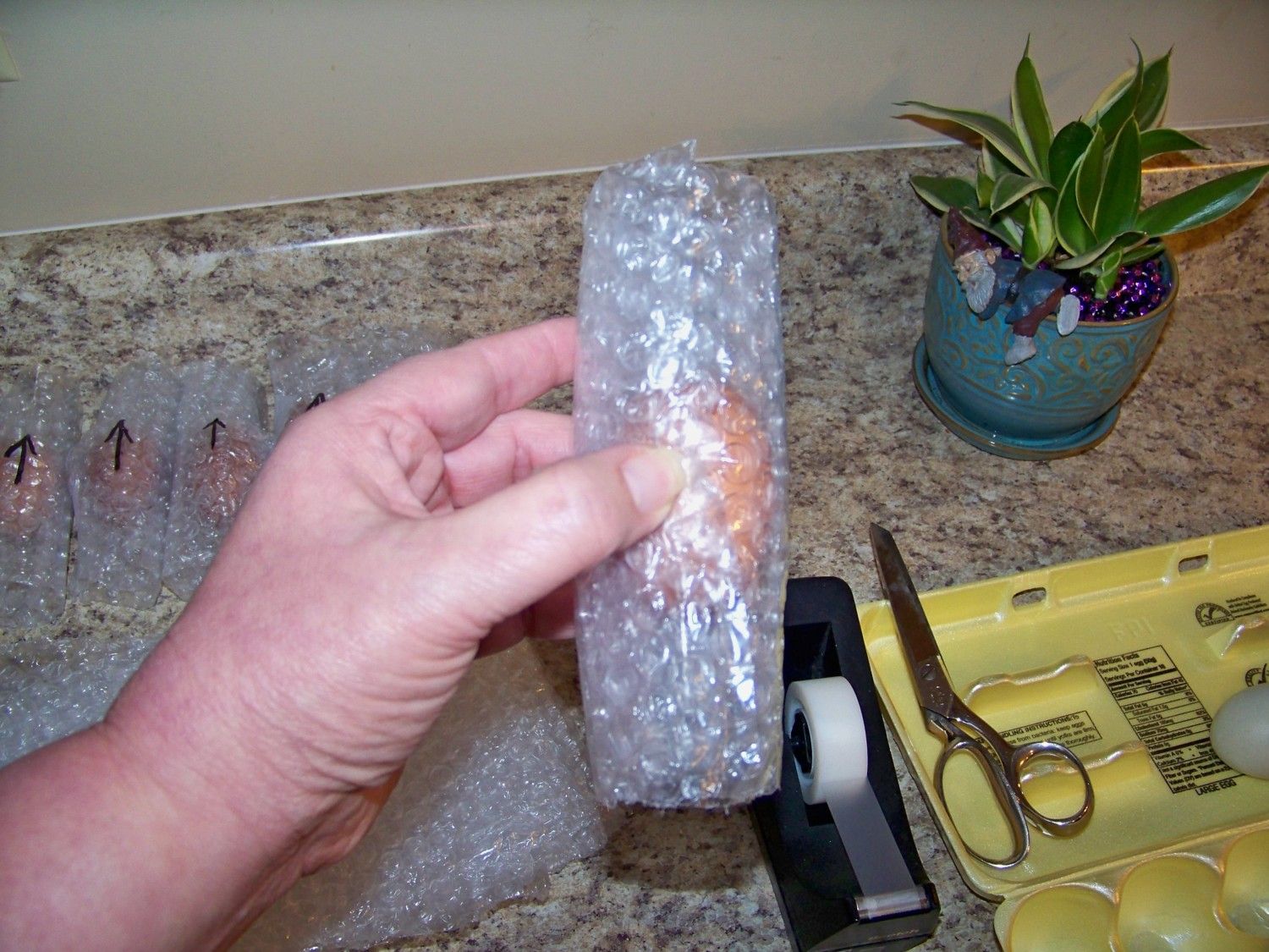I cut strips of bubble wrap to go around the egg twice (about 11"-12".) I paid close attention to which end of the egg was the air cell or big end. I marked the outside of the bubble wrap so that I could pack them with that end up. I believe it has a positive affect on the hatch rate.