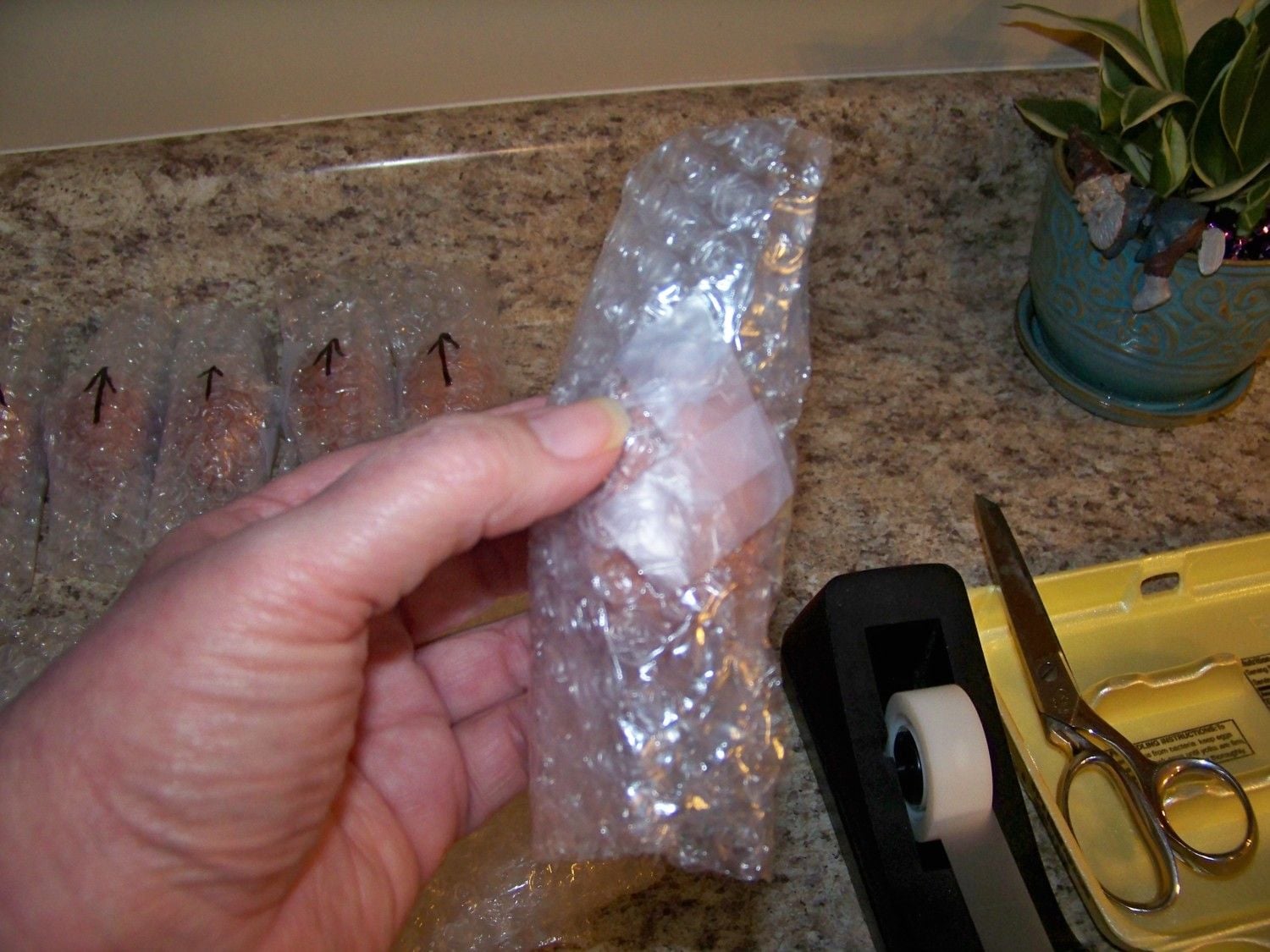 ...below the egg so that the egg would not slip down in the bubble wrap tube. I left the ends open to allow for air to get to the egg and to let the extra serve as a spring for the egg to bounce on. Here are all the eggs wrapped and ready to pack.