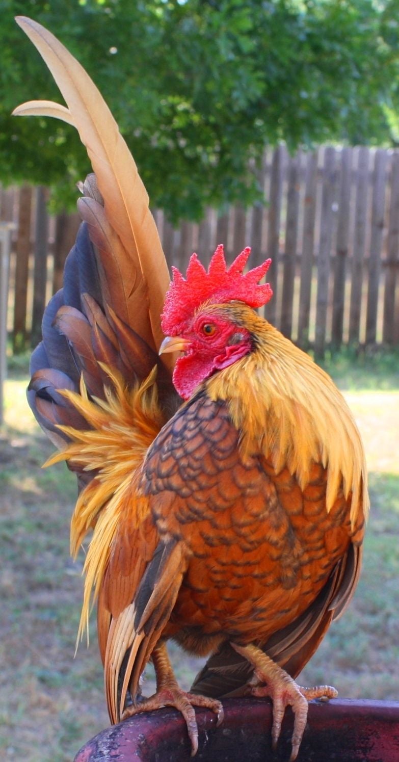 franz 1yr old ish bearded D'uccle, every time I go outside he slaps his wings 3 times stomps his feet and crows with all his might bantam