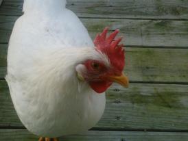 Amelia is a white Leghorn. She has a sweet high-pitched voice. She used to be very shy but is becoming more friendly. I'm not usually big on white chickens but she has grown up to be very pretty.