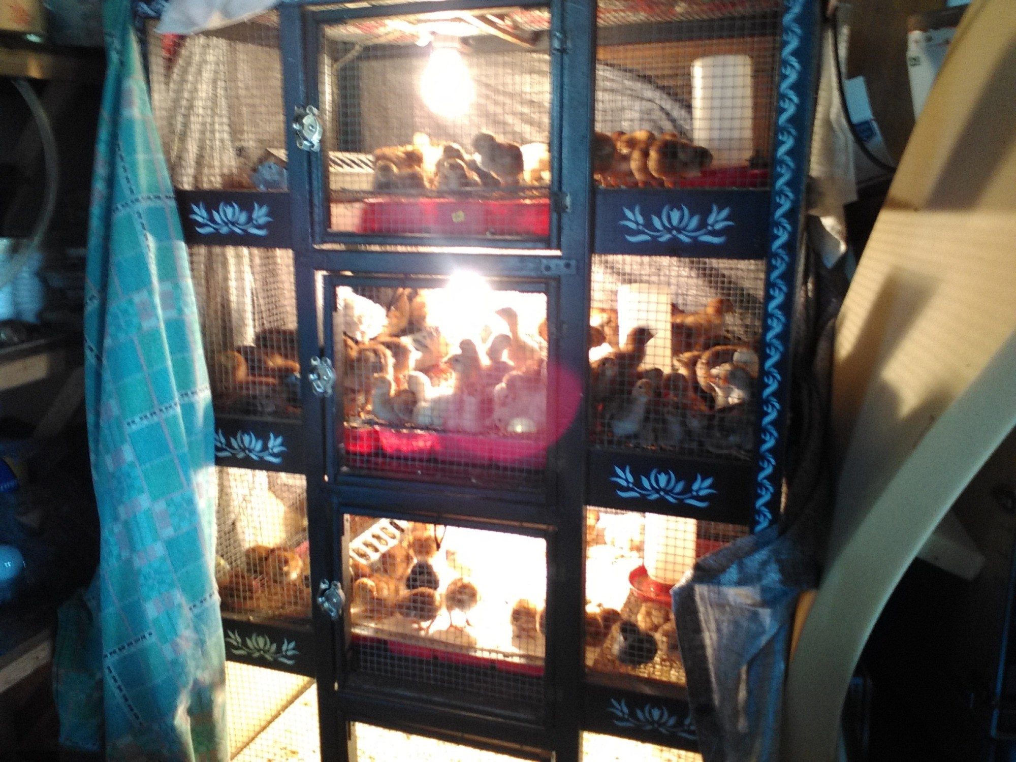 Here are some of the chicks. They are temporarily in a melon box until I can empty and clean their part of their coop.