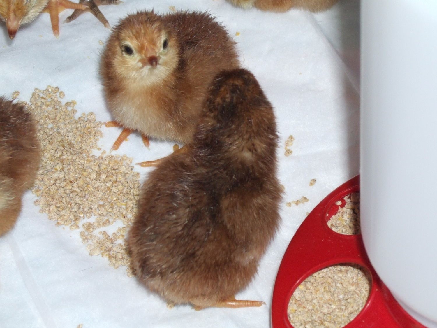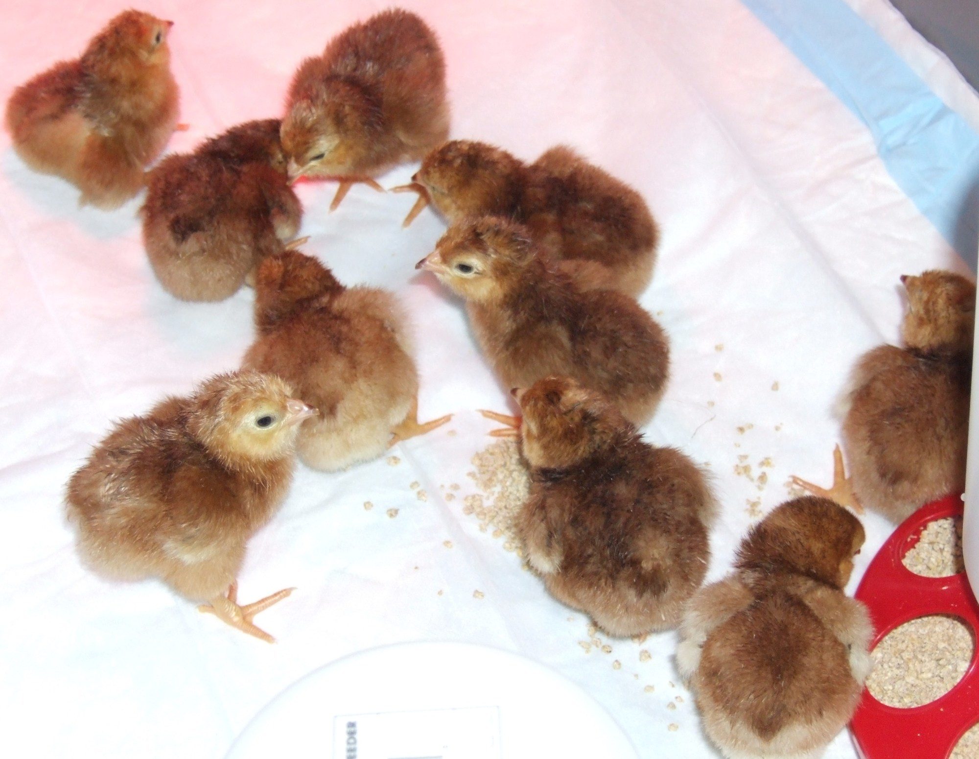 Here is my little Don Nelson chicks that I just hatched out yesterday. Received 13 eggs, 3 were clear, 10 went into lock down and all 10 hatched. WOW, was I tickled. They really are darker then these pictures show. I guess it is the flash and all the white background. They are real deep red/brown.