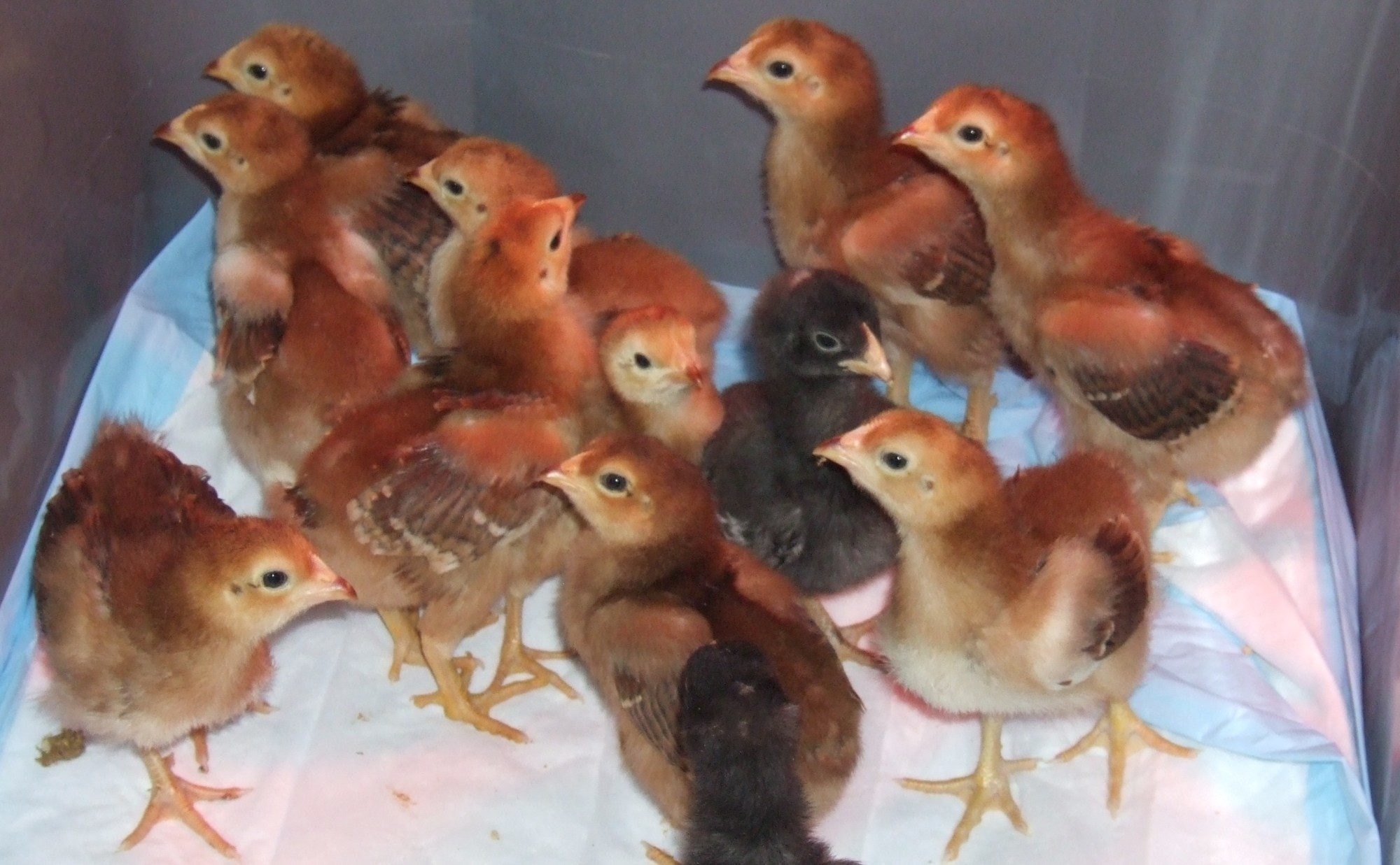 I fully know what you were saying about the dark ones. In the first picture, look at the difference in the first row of chicks. The one on the right is still so dark and the one on the left is lighter. There are 4 or 5 of them that are the darker color and the others are lighter. WOW, all nice chicks though.