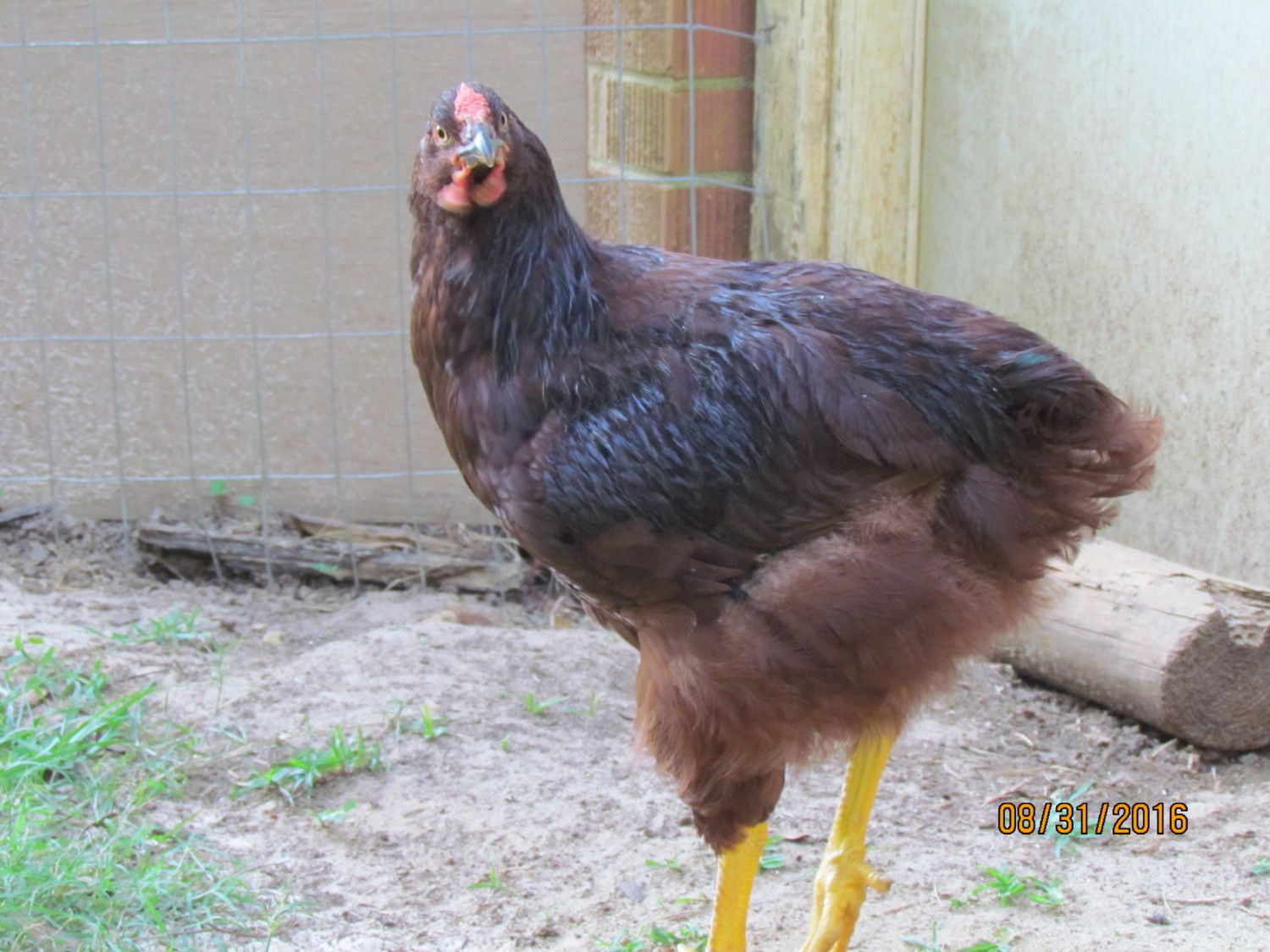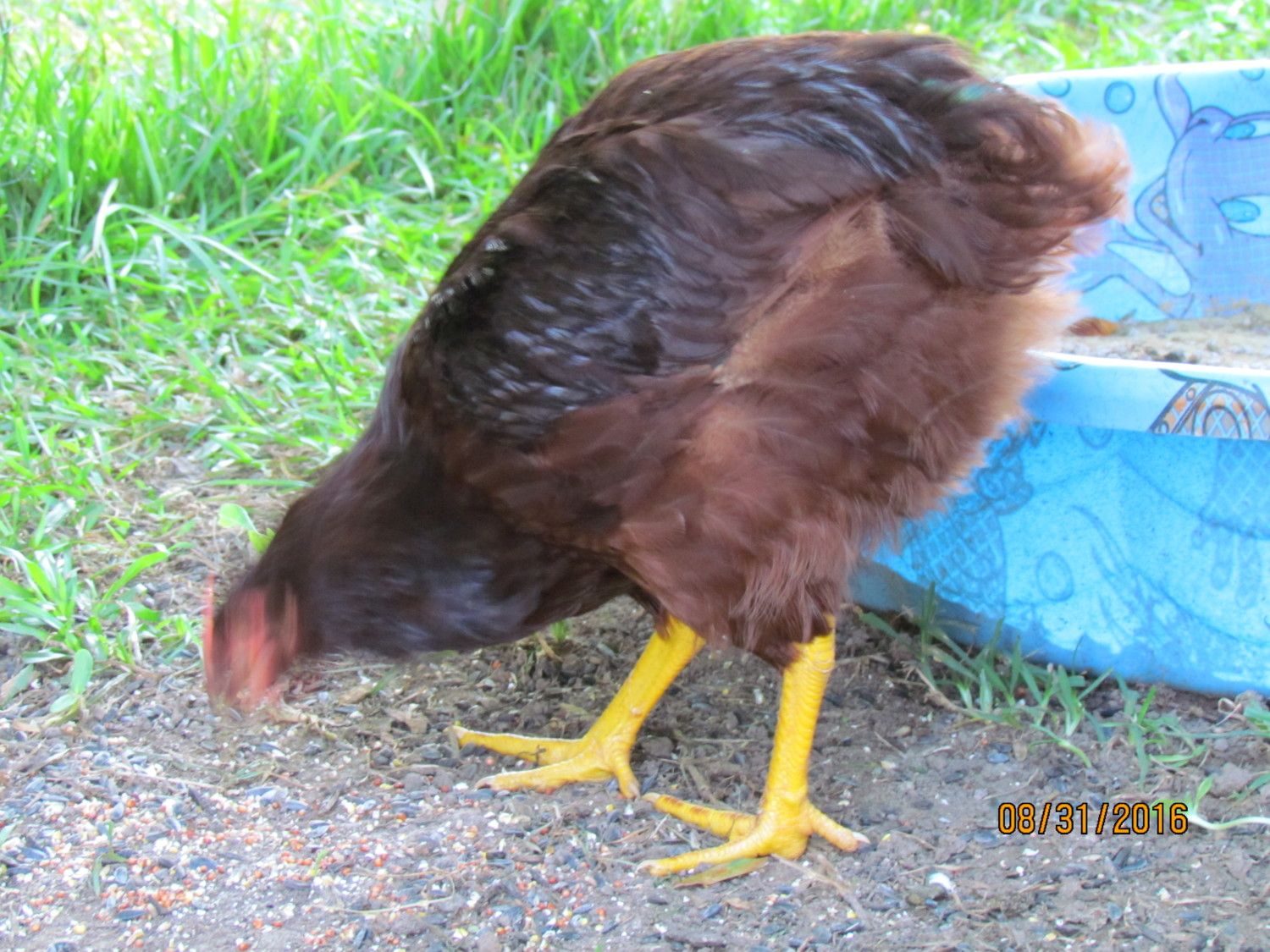 Genetics also plays a big role in leg color, along with a healthy diet. I used to feed my birds Purina, but switched to a "lesser quality" feed a few months ago... DuMOR. I supplement this with Purina Scratch Grains. The picture below is of my 14 week old RC red, and it's been eating DuMOR 24% and Scratch Grains since day 1, with occasional vegetable supplements. I haven't found any mention of Marigold in DuMOR chick feed, but as you can see, this chick has some bright yellow legs...The feed I use promises both marigold extract and added calcium for shell strength. I have used the feed for several months before deciding to offer my own supplements mixed into it. I saw no real results in shank color or yolk color until using the supplement. The one girl I got from Marcia had very pale shanks when I got her, but she was already a year old so not much I could do with it. I did see a but of improvement on the leg color while using the supplement, but what was done was done. When they get to a certain age they're already developed and not much can be done...