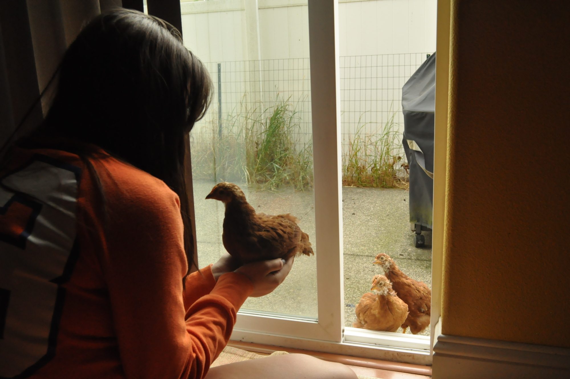 My daughter was involved in an Advanced Placement Science Class that required them to take a day old chick for two weeks and get them to imprint on the students. Afterwhich they had a "Chicken Olympics" to see which ctudent had trained their chich the best. Of course Popcorn (poppy for shirt) was the goold medal winner and there was many tears from my daughter about having to giver her up at that point. The teacher said we were more than welome to take the bird home but they had to come in threes. Hence Chicken Little and Chicken Nugget joined the ranks. We lice in a rural community outside of Portland Oregon that allows us to have hens but no roos. At this point the girls are now 15 weeks old and part of our family.