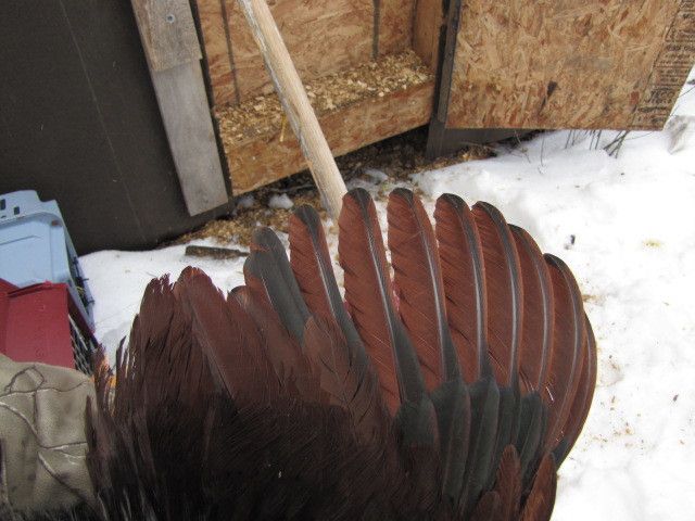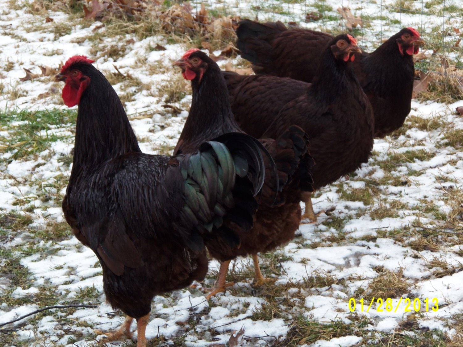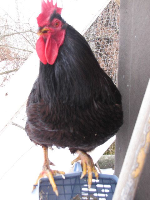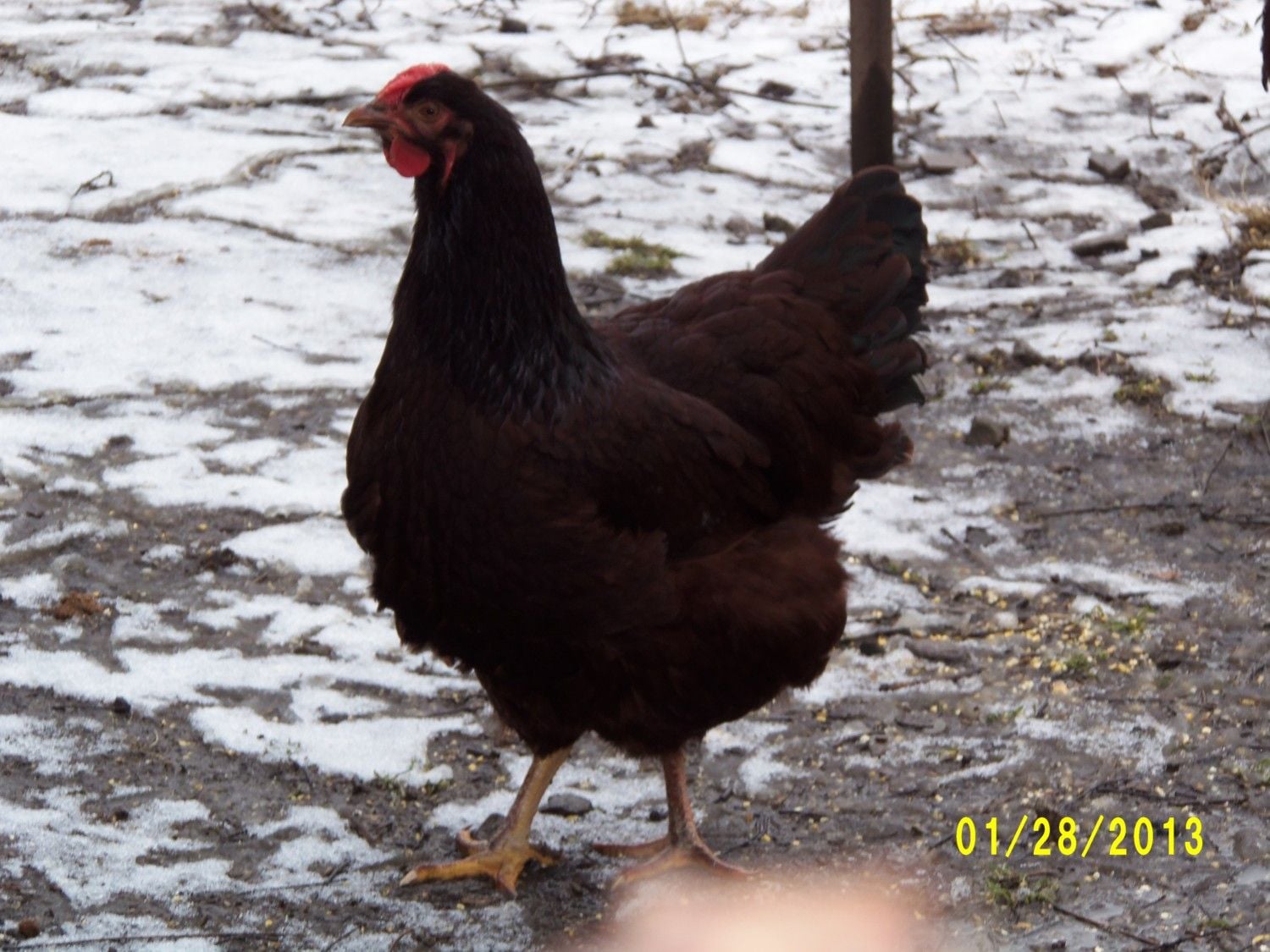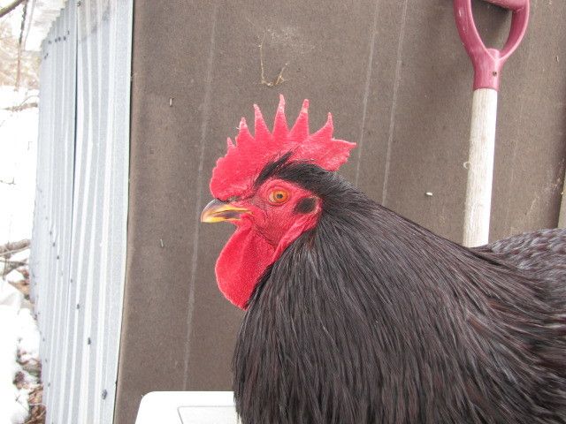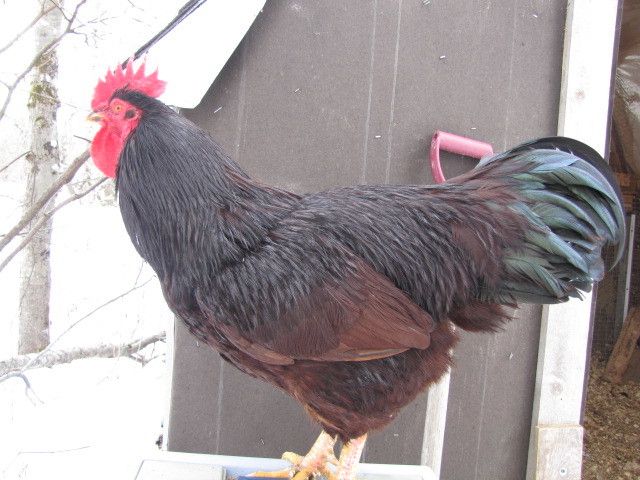 A friend from this thread Wayne asked me to upload his pictures of his two year old R I Reds Male for him for us to look at. These are for sure true Standard Rhode Island Reds and the bottom picture show the nice top line extended keel the nice green beetle green tail color. His eye color is what is called Red Bay for you who worry about eye color. On birds that are dark like this guy they normaly are always on the money for color. He has nice horn leg color. He sent me several pictures these I thought would give you a idea what he has. Also look at his wing color not just the black but some part of the wing a lot of people forget about the red in the wing. Mrs. Donaldson use to say you want the red wing color to match the hock or side of the bird or a nice rich red color. He has this in this picture. Considering his age, the cold conditions I think you got a nice bird here and this is what a two year old male should look like. He kept his youthful shape and he should pass this on to his chicks.