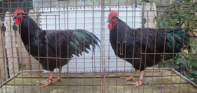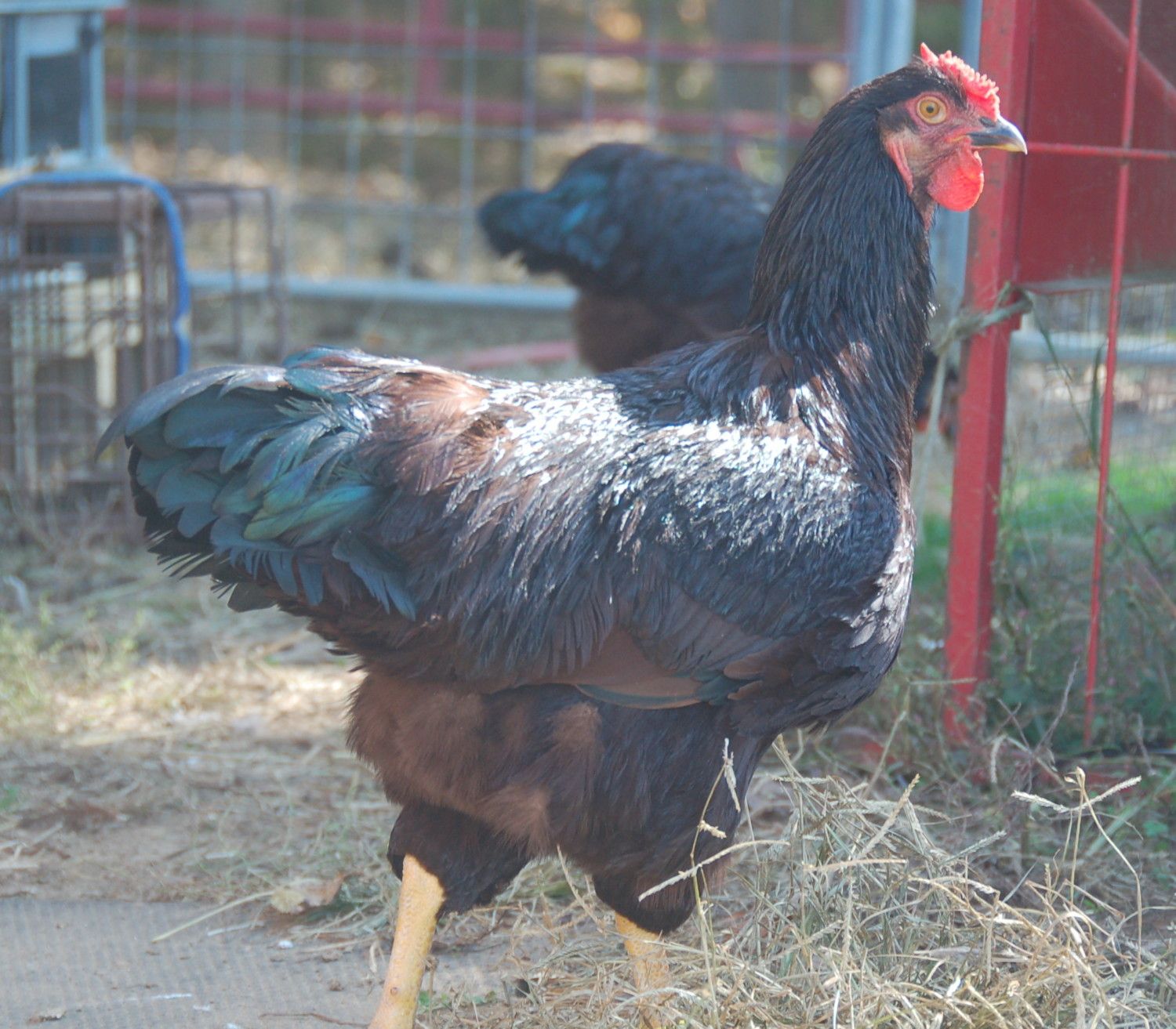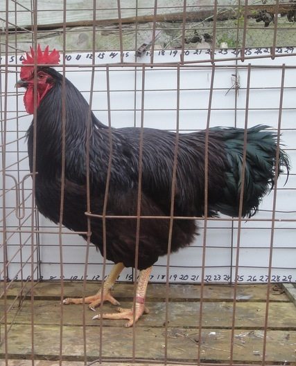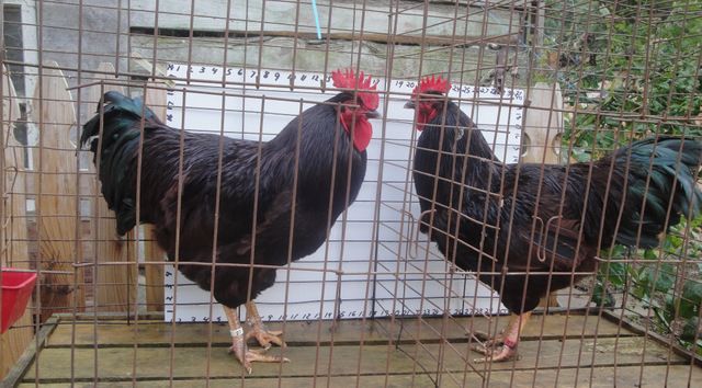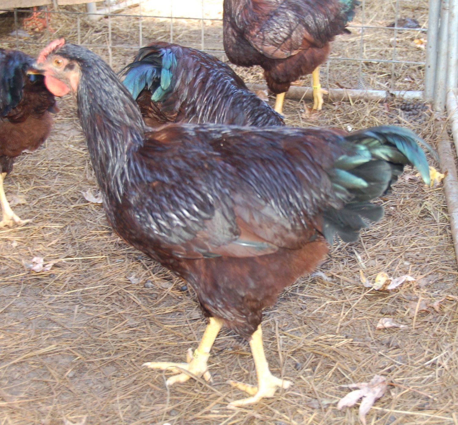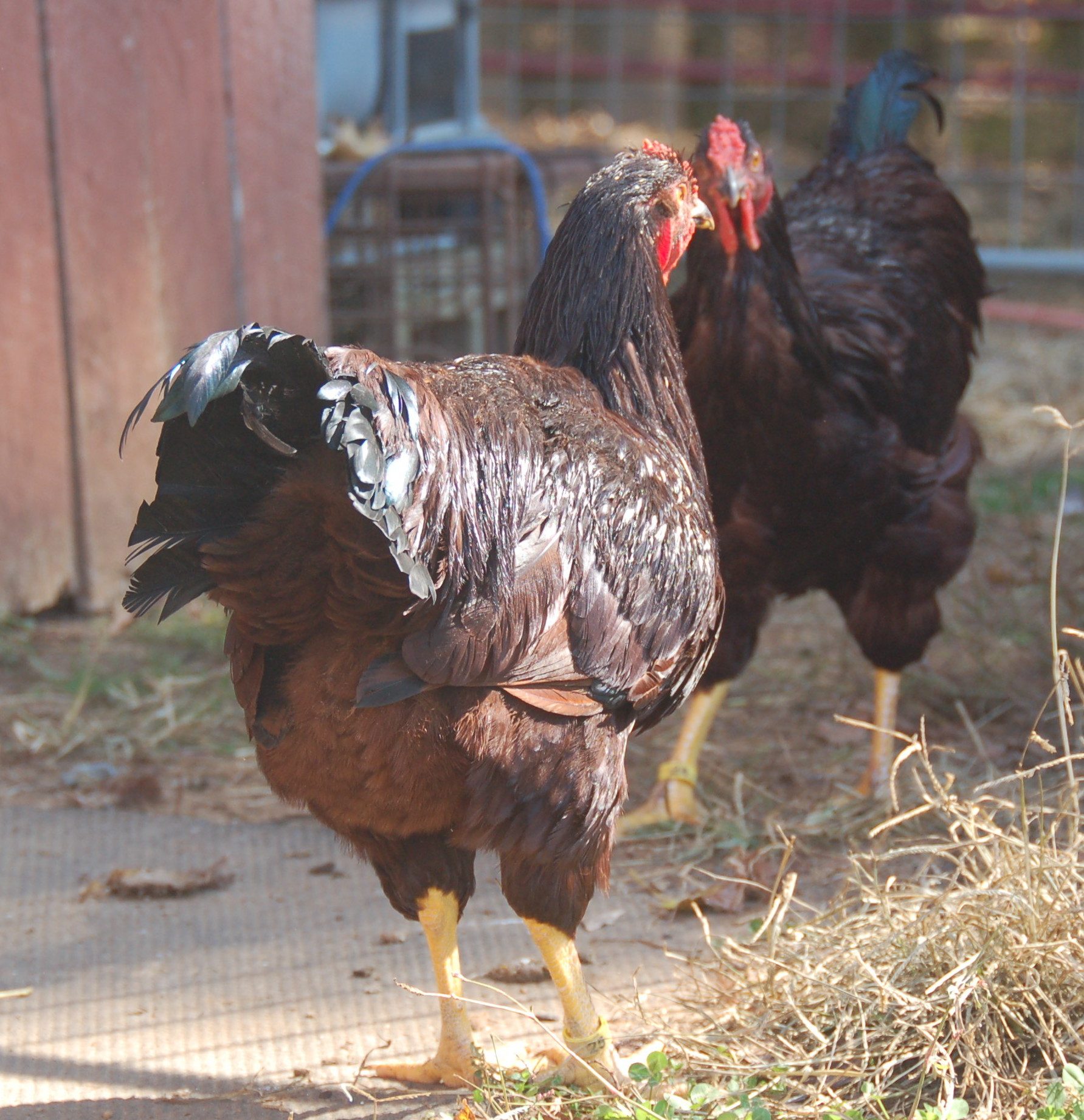 #1 choice is on the right. He has been with the layers for four days and was a real pain to catch. (for me and him both) He is riled up and his wings are askew. I had to really struggle to hold on to him and get him in the cage. He would like to take the head off of boy #2 on the left.