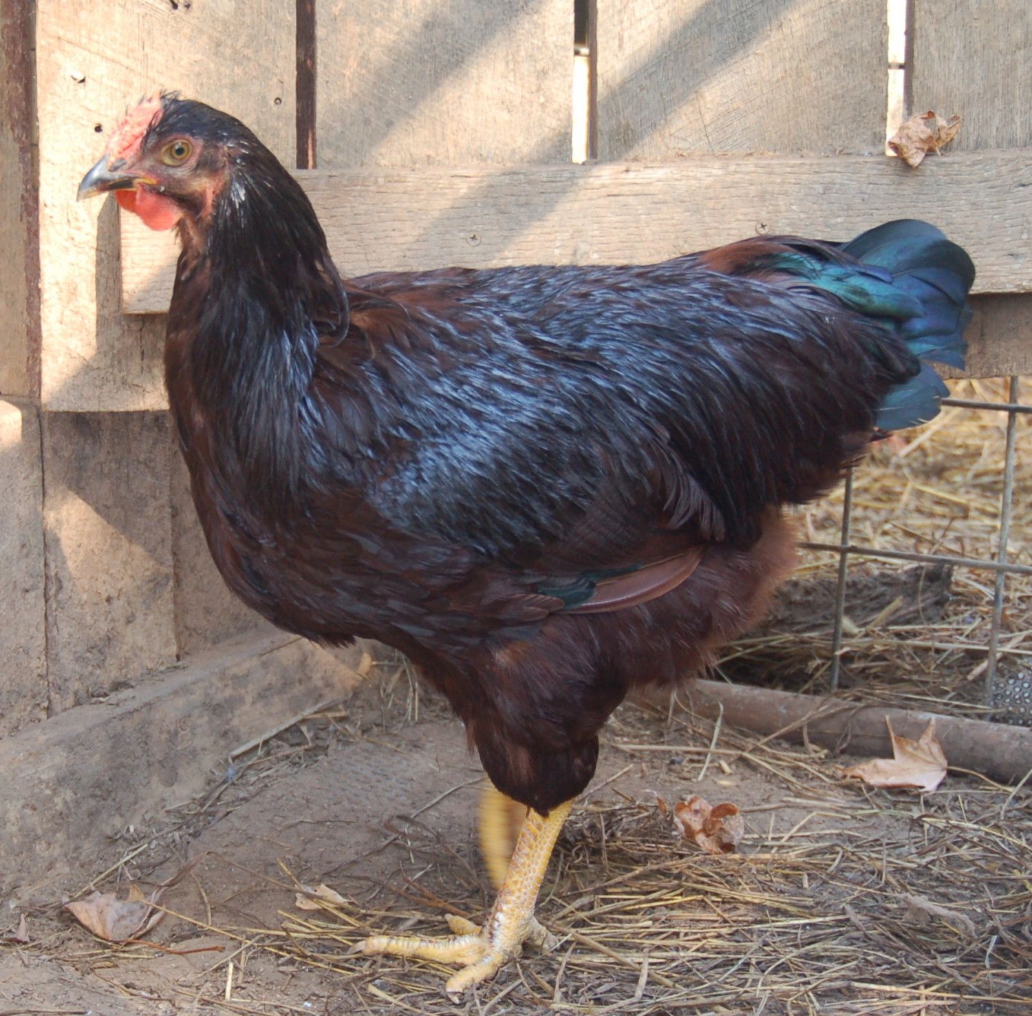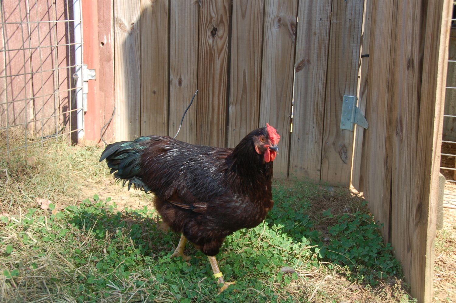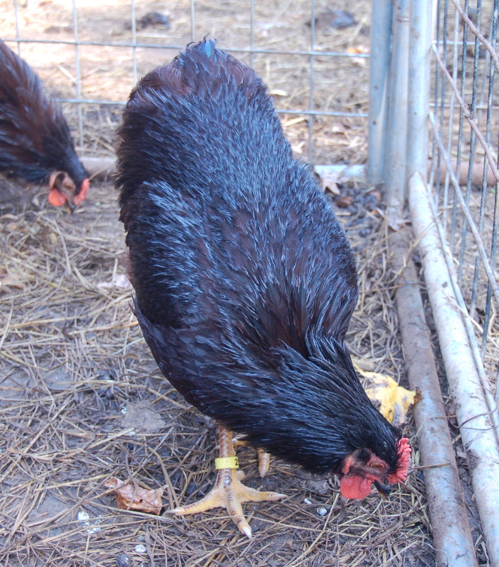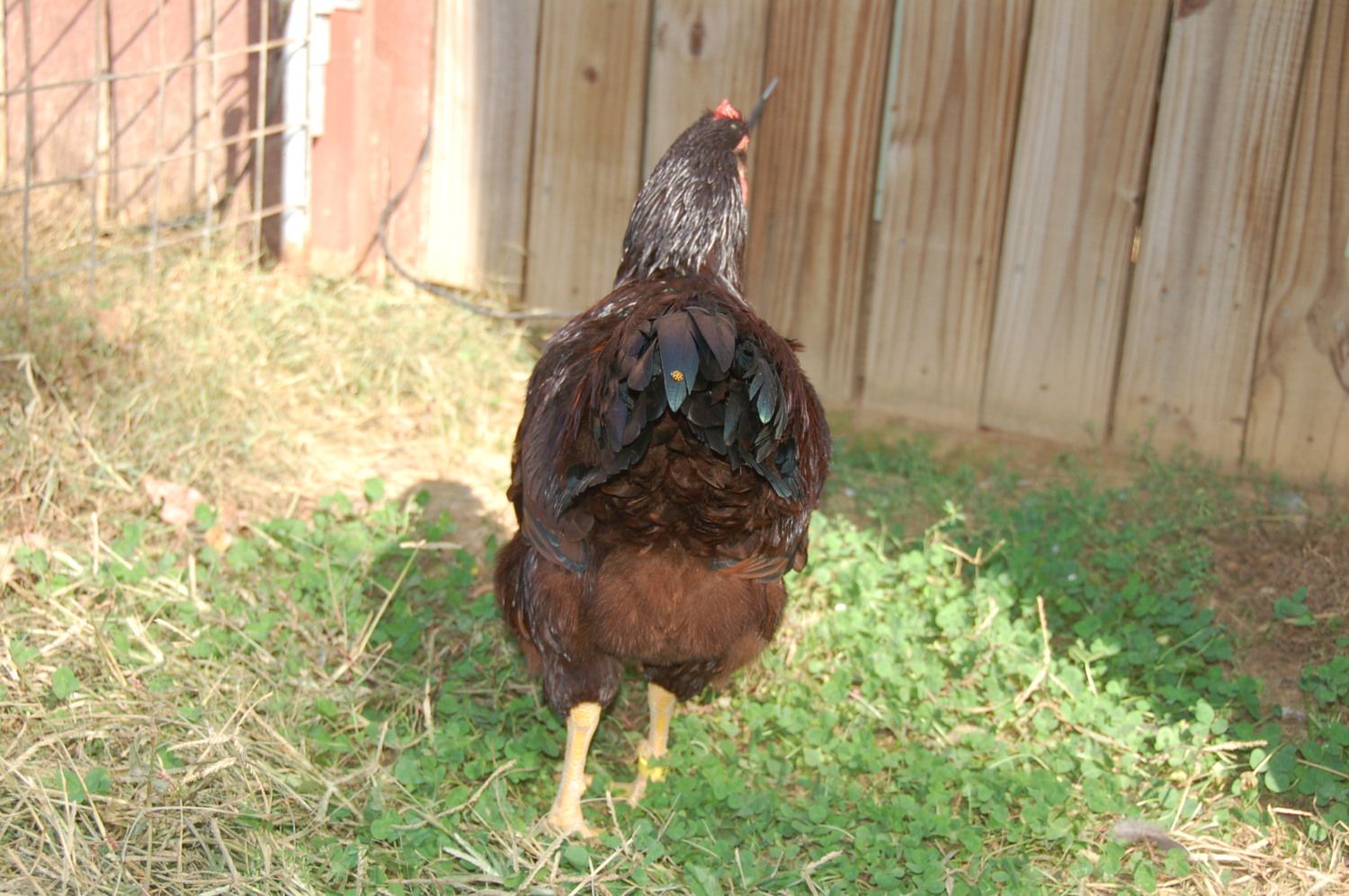 #1 choice is on the right. He has been with the layers for four days and was a real pain to catch. (for me and him both) He is riled up and his wings are askew. I had to really struggle to hold on to him and get him in the cage. He would like to take the head off of boy #2 on the left.