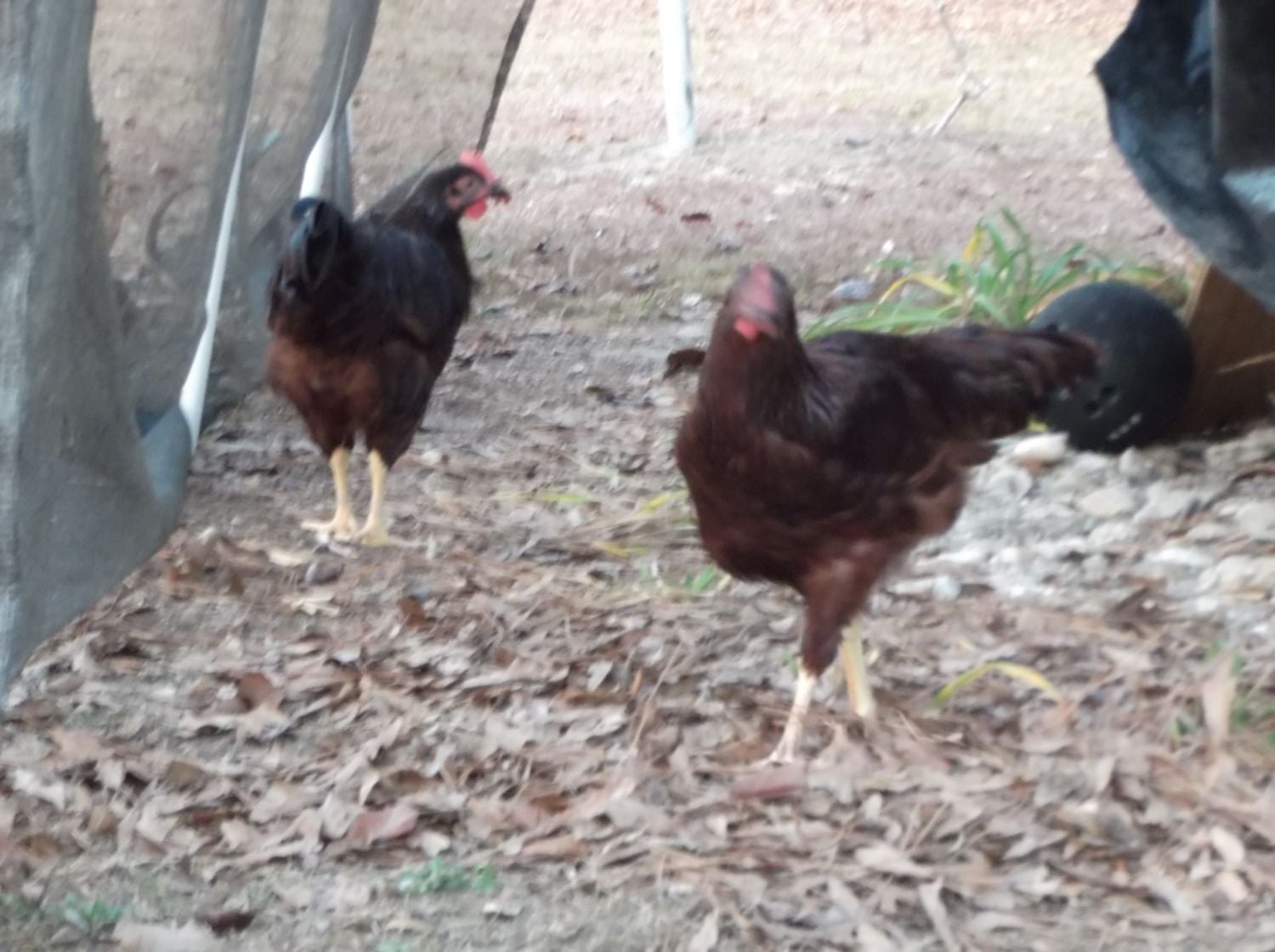Matt I have 3 of the cockerels. They are from the Mohawk line. I got them from Jon on our Facebook page that we're members of. They are around 5 months old. This is my first ones of these. This pic below is 2 of the cockerels. You can't really tell about the legs of the one by the PVC pipe but the other one to the left, are the legs where they should be for SOP? I haven't really looked at their combs since they've gotten older. Wondering how long one keeps them to see how they will turn out?