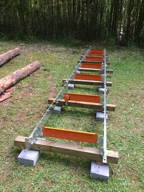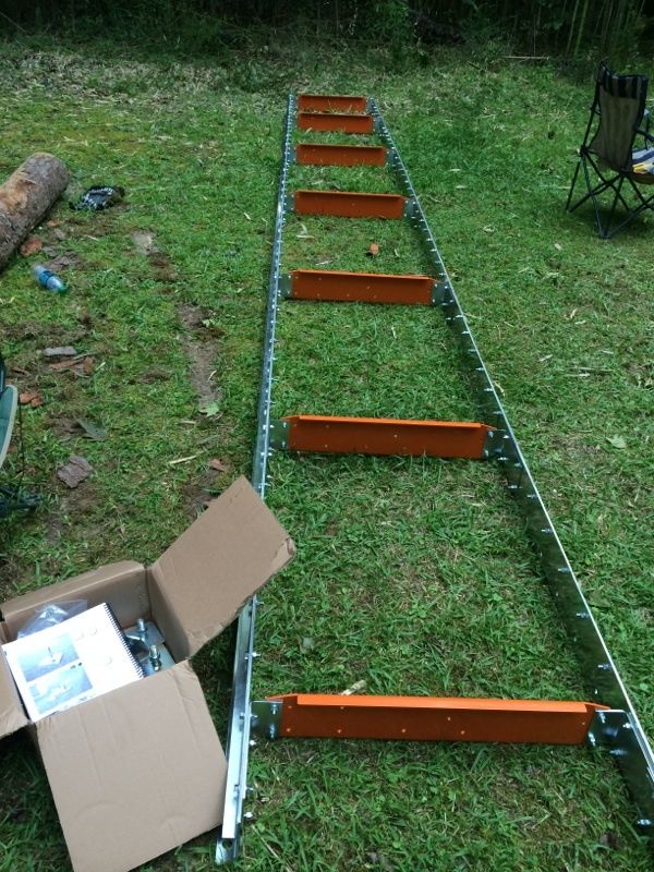 The beginning steps involved getting the HUGE book of instructions out, and assembling the rail/track that the bandsaw mill would slide down. This was pretty easy to begin with, even adding on the two bed extensions that made this able to hold 20 foot logs:
