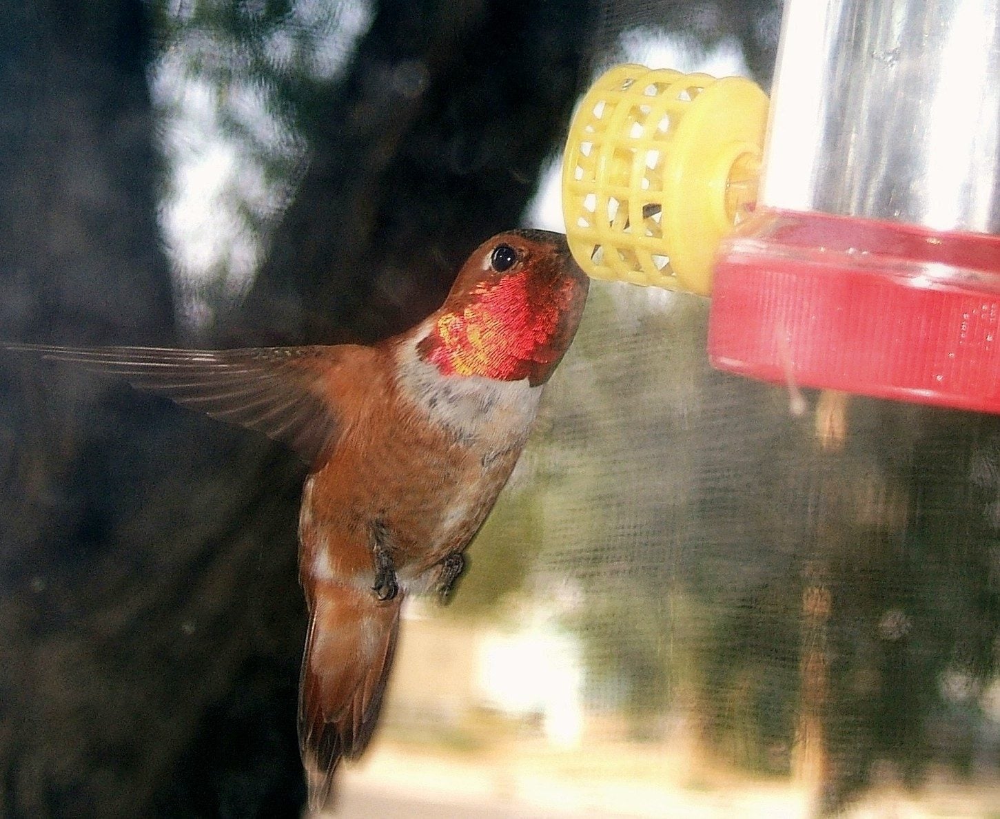 My dad feeds the hummingbirds at his house and at the cabin. He only gets the Ruby Throated hummingbird. And only two feeders at each place. He has about 13 hummers coming in regularly at the house, a few more at the cabin. A few years ago, he was sitting on the screen porch reading his Sunday paper when the male hummers started chasing each other around. One of them missed on his attack and wound up sticking his beak into the screen and getting stuck. He tried to get out for a couple of minutes, putting it into high speed reverse but was stuck too tight. My dad was worried about the poor little guy so he got up, gave it a tap on the tip of its beak and POP! it was loose and flew away.