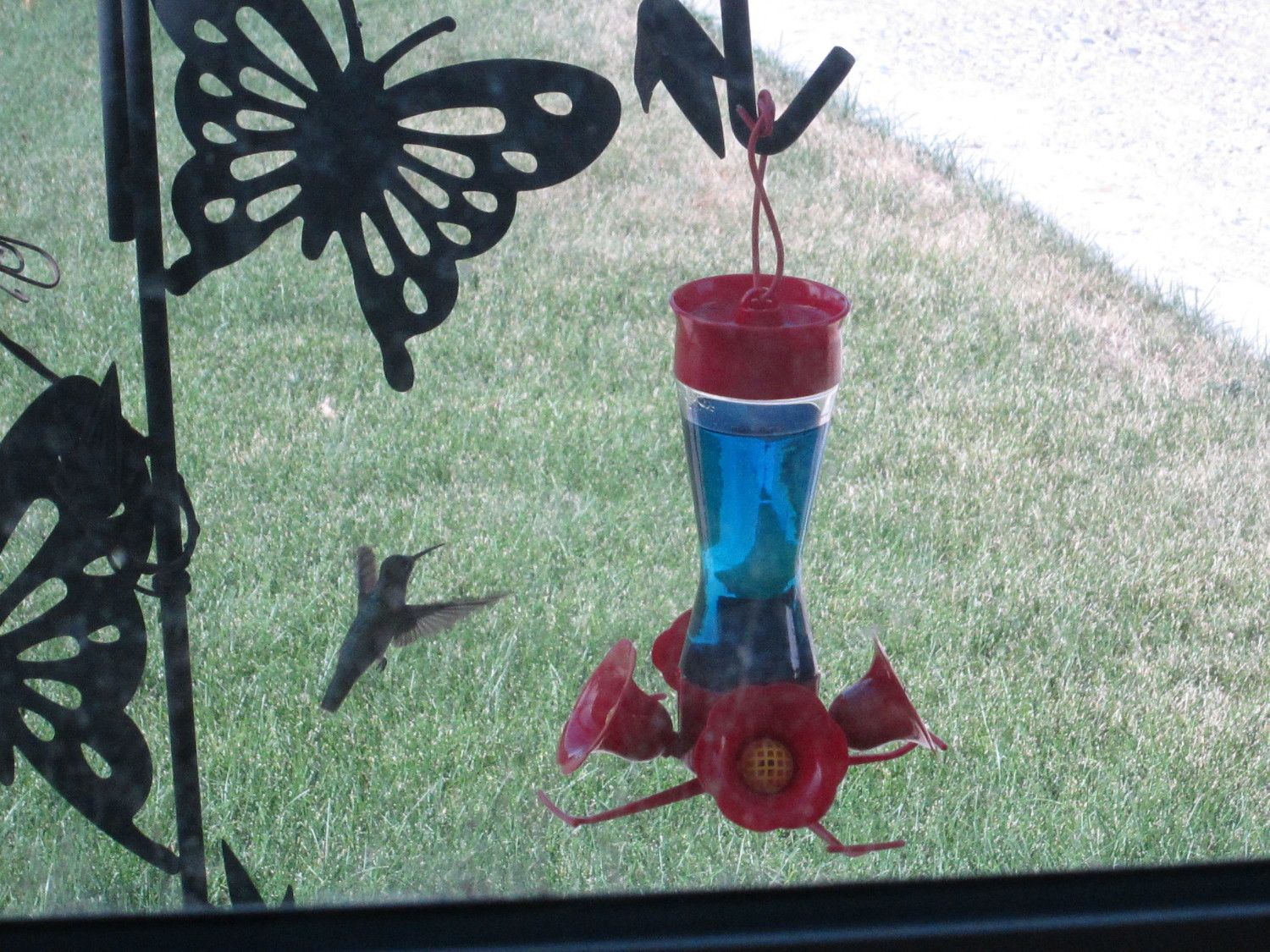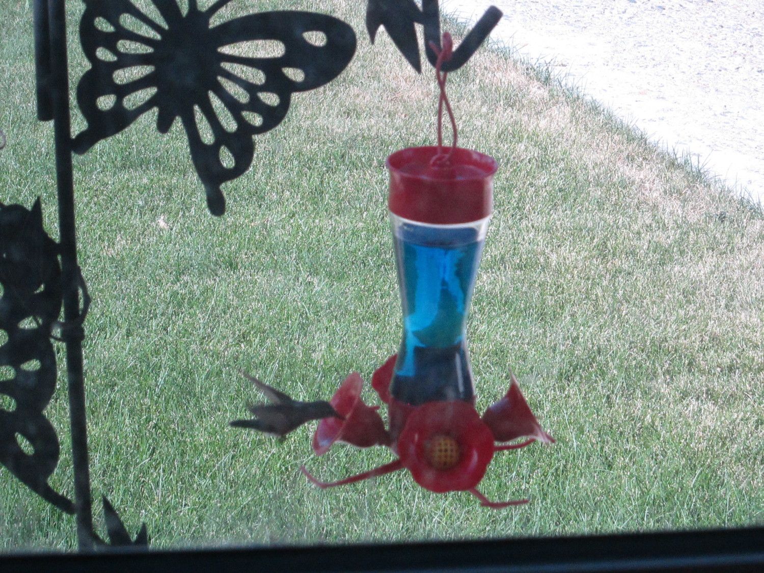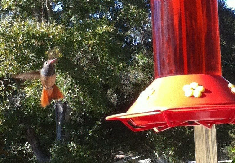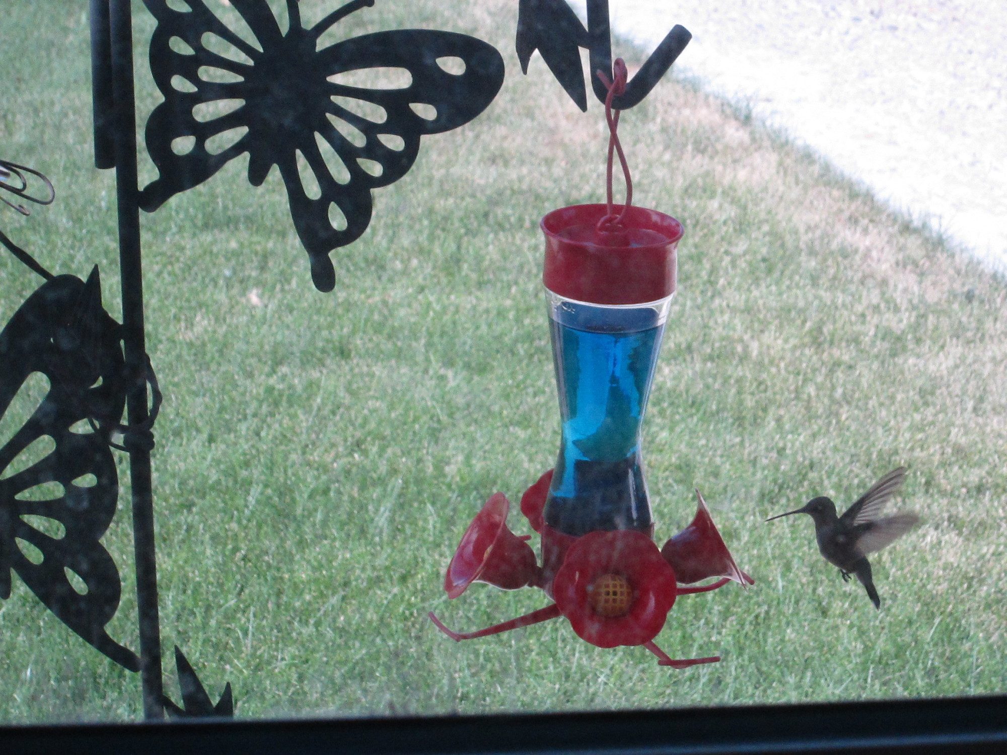 My dad feeds the hummingbirds at his house and at the cabin. He only gets the Ruby Throated hummingbird. And only two feeders at each place. He has about 13 hummers coming in regularly at the house, a few more at the cabin. A few years ago, he was sitting on the screen porch reading his Sunday paper when the male hummers started chasing each other around. One of them missed on his attack and wound up sticking his beak into the screen and getting stuck. He tried to get out for a couple of minutes, putting it into high speed reverse but was stuck too tight. My dad was worried about the poor little guy so he got up, gave it a tap on the tip of its beak and POP! it was loose and flew away.