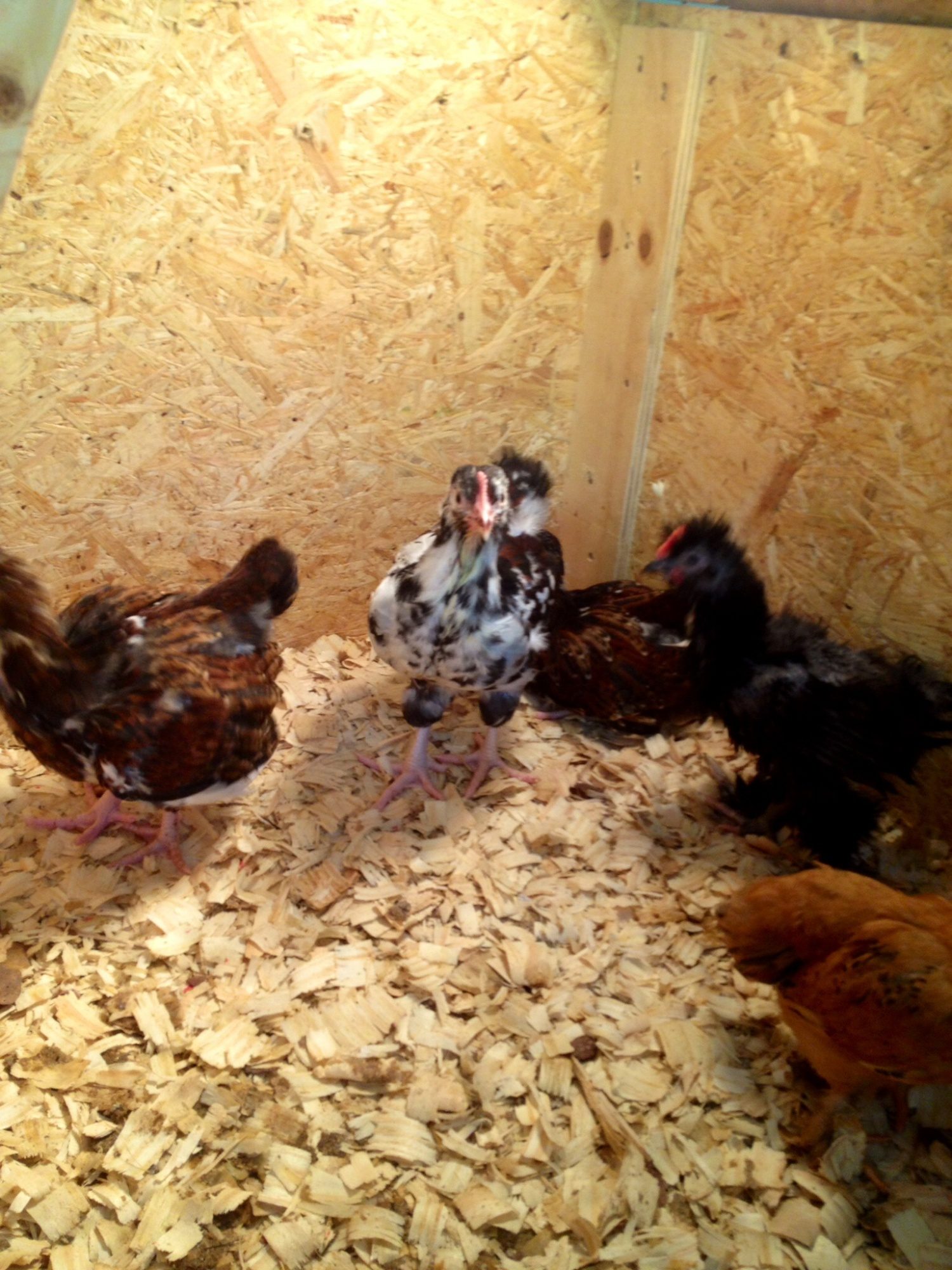 Really excited to see what that pullet at the bottom looks like all grown up! My Jubilee, Reba turned out to be a smart Mommy. She hatched 2 out of three eggs and adopted 2 more chicks! She's an excellent Mama to the 4 in her brood! She has proven to be very smart at something as well as gorgeous! She even scared my boxer , Ruby to death when she was trying to sniff their fuzzy Ameraucana butts!@mollybuck Both options should be possible. Putting your blue cockerel (out of jubilee x splash) over jubilee hens or your blue hen (out of jubilee x splash) with a jubilee cockerel will bring you one step closer to those blue jubilees. Always put the next generation together with a pure jubilee and you will get there. When having extra time and space, you can always put together the two blues and see what you get. This is the little cockerel I was talking you about. He is from the beginning of April. For a Wyandotte bantam he is quite a heavy boy for his age. [COLOR=B42000][/COLOR] [COLOR=B42000]