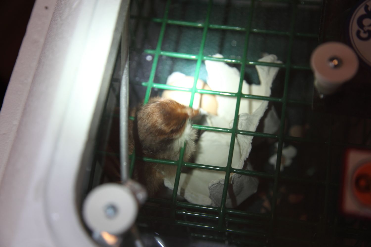 If you don't cover the big holes somehow and some time occurs between the chicks hatching, the older ones will climb on the egg carton, eggs, or each other, through the big holes. I waited too long obviously, but didn't want to cool down the hatcher by opening it too much since some chicks were wet. Timing is everything. It takes practice in opening the hatcher lid and then the suet feeder lid in a quick motion.