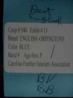Got no trophy or ribbon it was not a APA show, Only the JR.s got ribbons & the bigger winners in the open show got a plack, here is my coop card with my places on it, & my girl who got them.Some of us would really like to see Rogers bird and her awards..you can pm them ..I told you that you were going to need a trophy room..
