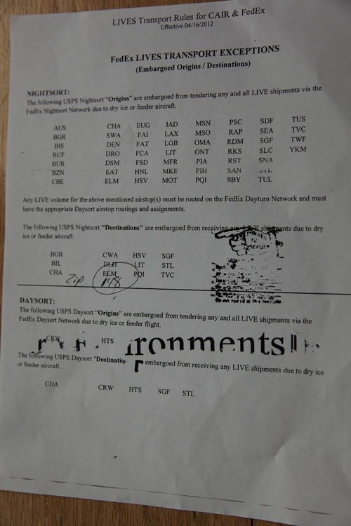 I think they are talking about shipments needing to go onto smaller aircraft to get to the destination.I called the FDA couple days ago..they said it is not them...FDA has no embargos imposed at this time....they welcome all NPIP birds shipped to NYS and the other zip codes listed in the embargo ..yet my zip appears in this embargo....There is another lady in here, if she feels like it can explain more.....it has something to do with USPS uses fedX air service for thier mail shipments and live animal shipments..it has something to do with dry ice and feeder whatever that is...YOU CAN SEE IT LISTED PAGE BOTTOM....Birds that were being shipped to me were turned around and sent back yet not long ago others were shipped without incident.. no one at fed X has given anyone a reasonable explanation yet as to what exactly that means.as you can see they stamped it but looks unreadable.