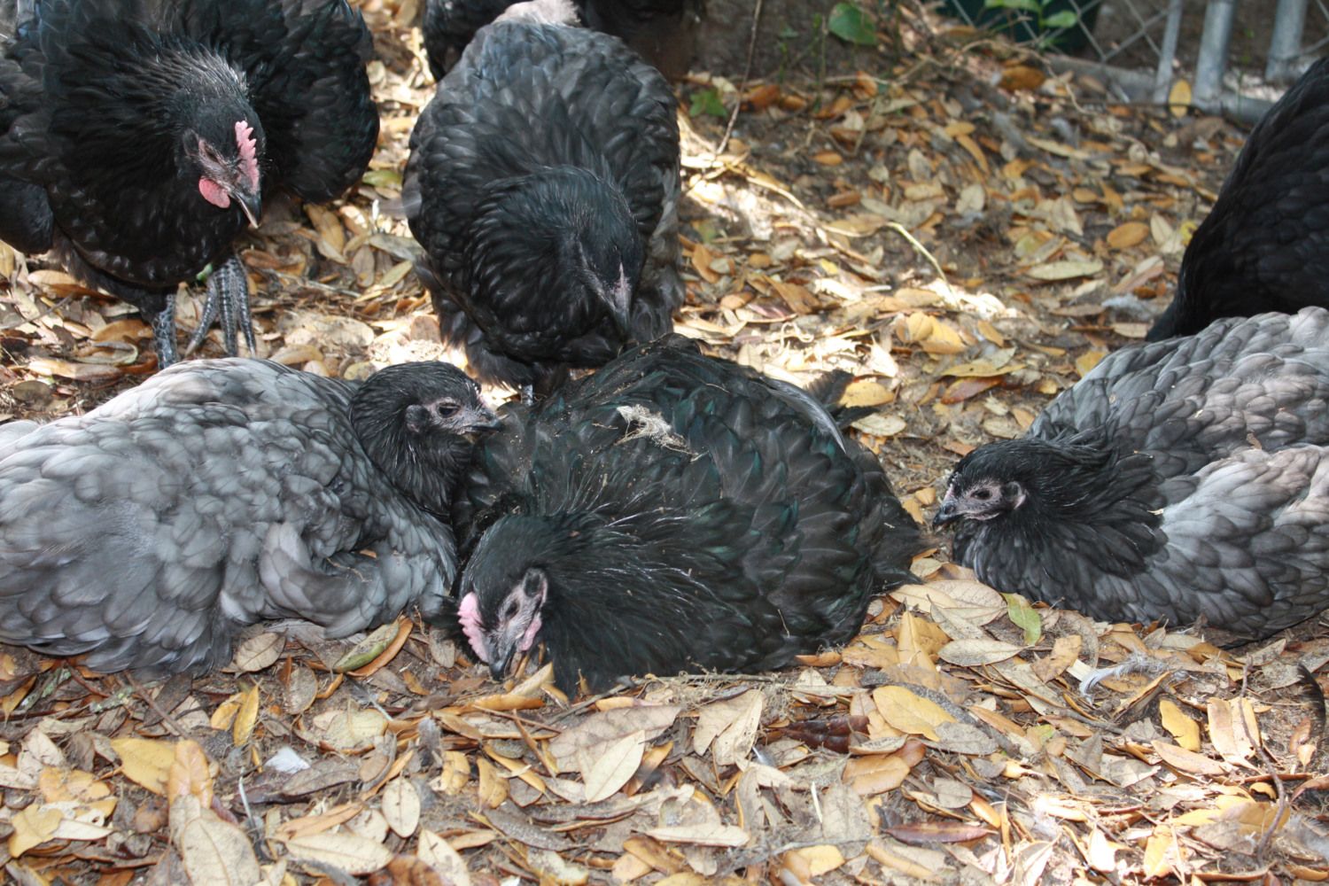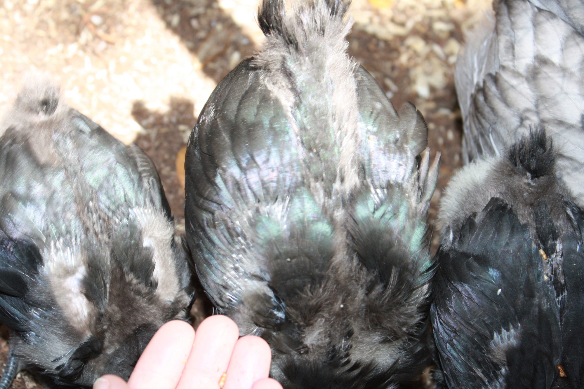 This is a perfect example of how hard it is to get a good blue and how much I respect those of you who have accomplished that feat! I put my best black hen with a friends giant Splash cock (before I got Roger's splash) and these blues are the result; 3 eggs, same hen and rooster, three totally different shades of blue: clockwise from the left around the cockerel laying sown in center, lightest blue of the bunch is okay, then there is a charcoal that almost looks black and then a mix of dark and light feathers. This is one breeding I wont be repeating!