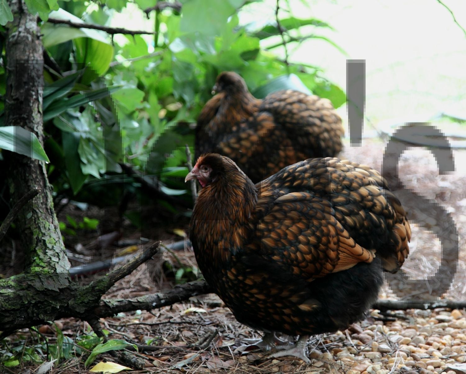 Here are two of the 6 month olds. You can see their tails coming in. They are getting that cobby look. In the second picture you can see what these naughty girls do all day long. They prance back and forth in front of the cockerel pen. Drives them batty. They are in for a rude awakening IF those boys get their opportunity. If I do decide to breed those young cockerels I will need to put them in with the hens when the time comes. They will need some lessons on courtship. (BTW, their skirts are very black, but they were just dusted)