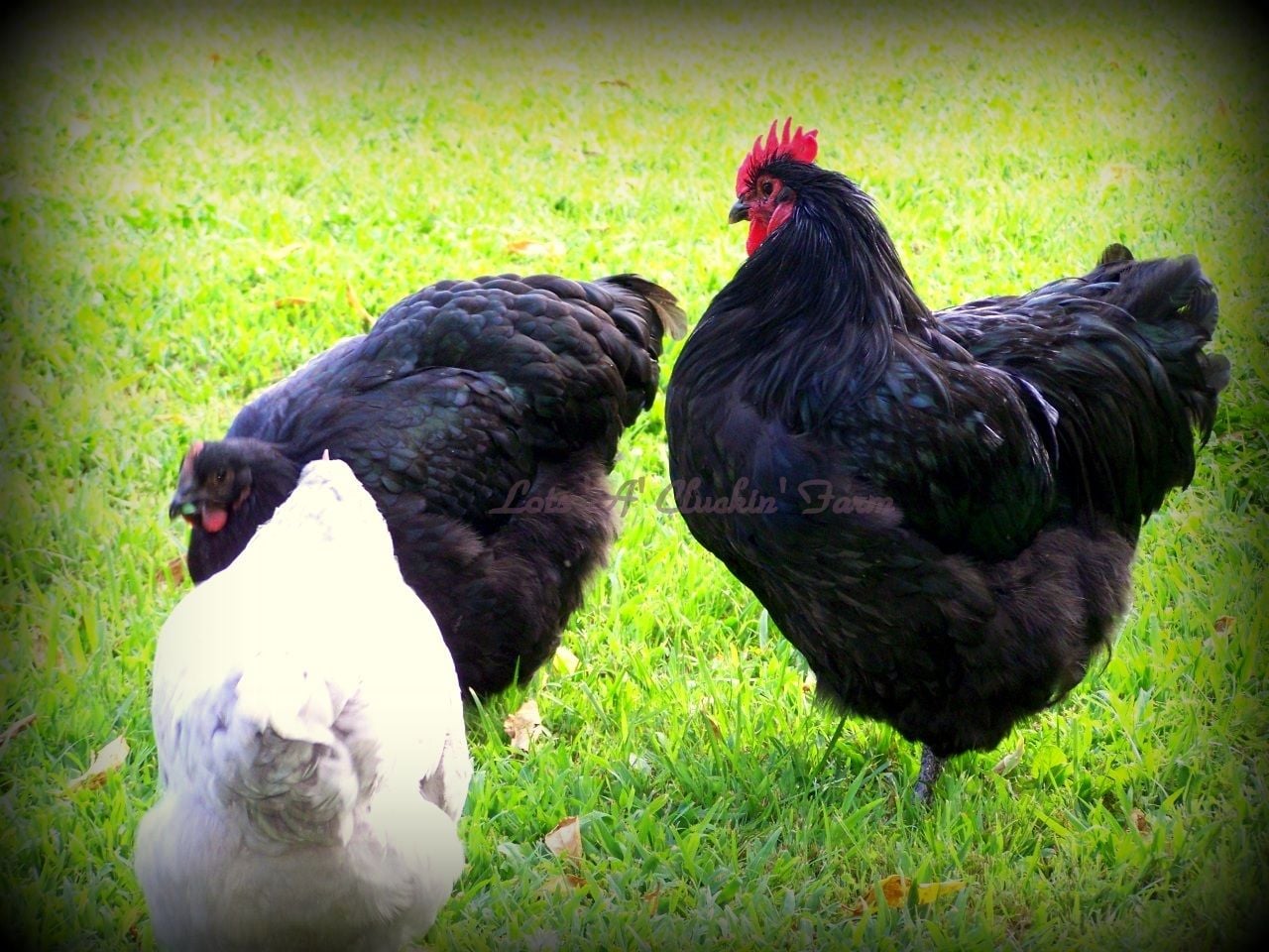 Thanks for all the great information! I have the standards for this breed. I did not think I needed the whole book... at least not yet... lol. Anyway, here are a few pics of my chickens. They are very camera shy so the pictures are not good. They always seem to have their heads down when I try to snap some pictures. The one of Titan (my roo) is alittle deceiving. He is actually taller but in this picture he is kinda crunched down. The next picture is of my pair of girls. They look alittle butterbally looking in the pictures because they have a huge behind but when standing up they do have a back... what is everyone's thoughts of their shape (at least from what you can see in the pictures)? Thanks for all the feedback!