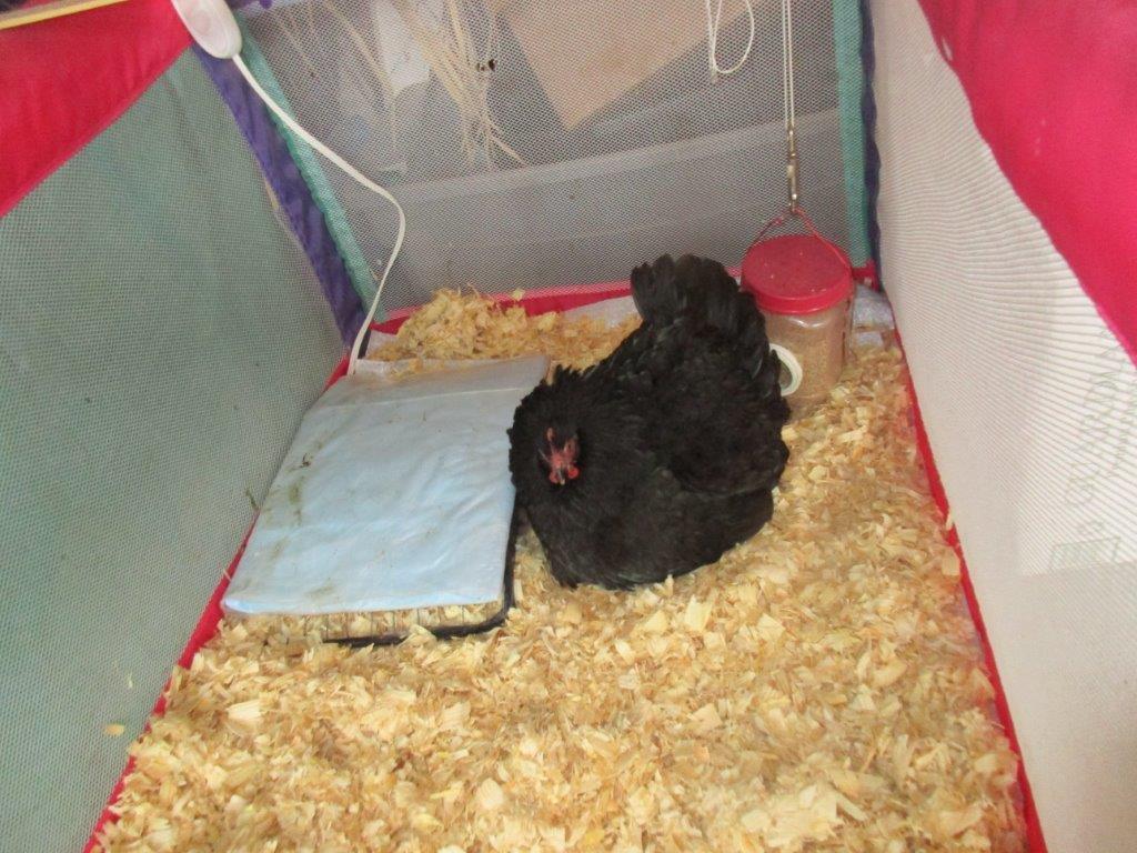 Because she's a bantam & the chicks are full size, it's easiest to just put her into the brooder & then add a "mama heating pad" for the overflow.