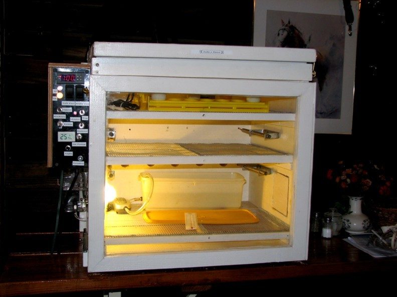 I just had to share pictures of the awesome bator my DH built for me "MacGyver" style. Half of it came from bits and pieces from his shop where he saves "stuff"! We purchased the digital thermometer on ebay and the digital hygrometer. Also an extra thermometer. We bought hinges and Plexiglas (double panes top and front) after he broke two pieces of glass. He wanted lots of lights and switches (which he had) and they are really fun! The bottom hatching area is not quite complete but we have out first test eggs on the top shelf. Please notice the special extras! Small side doors for reaching in to grab a chick or egg in lock-down. Also the water pan fills from the outside and is equipped with an aquarium aerator (also purchased) that will bring the humidity up several notches in just a few seconds! It is all attached to a back up system in case of power failure. (We already had that). I know it will fly. Just not sure if it will make eggs into chicks yet!