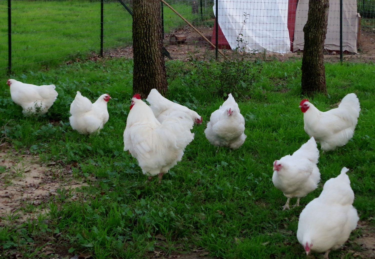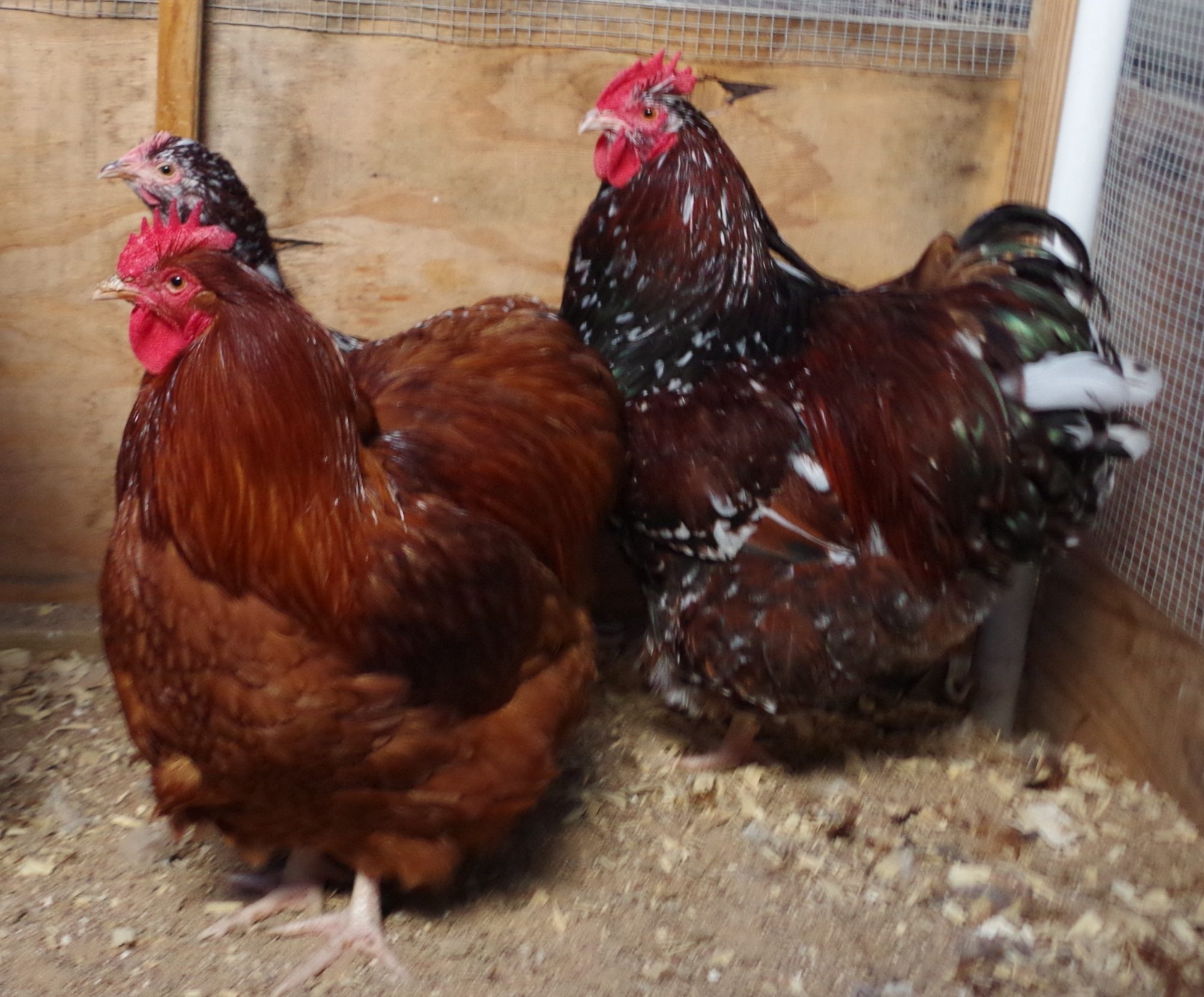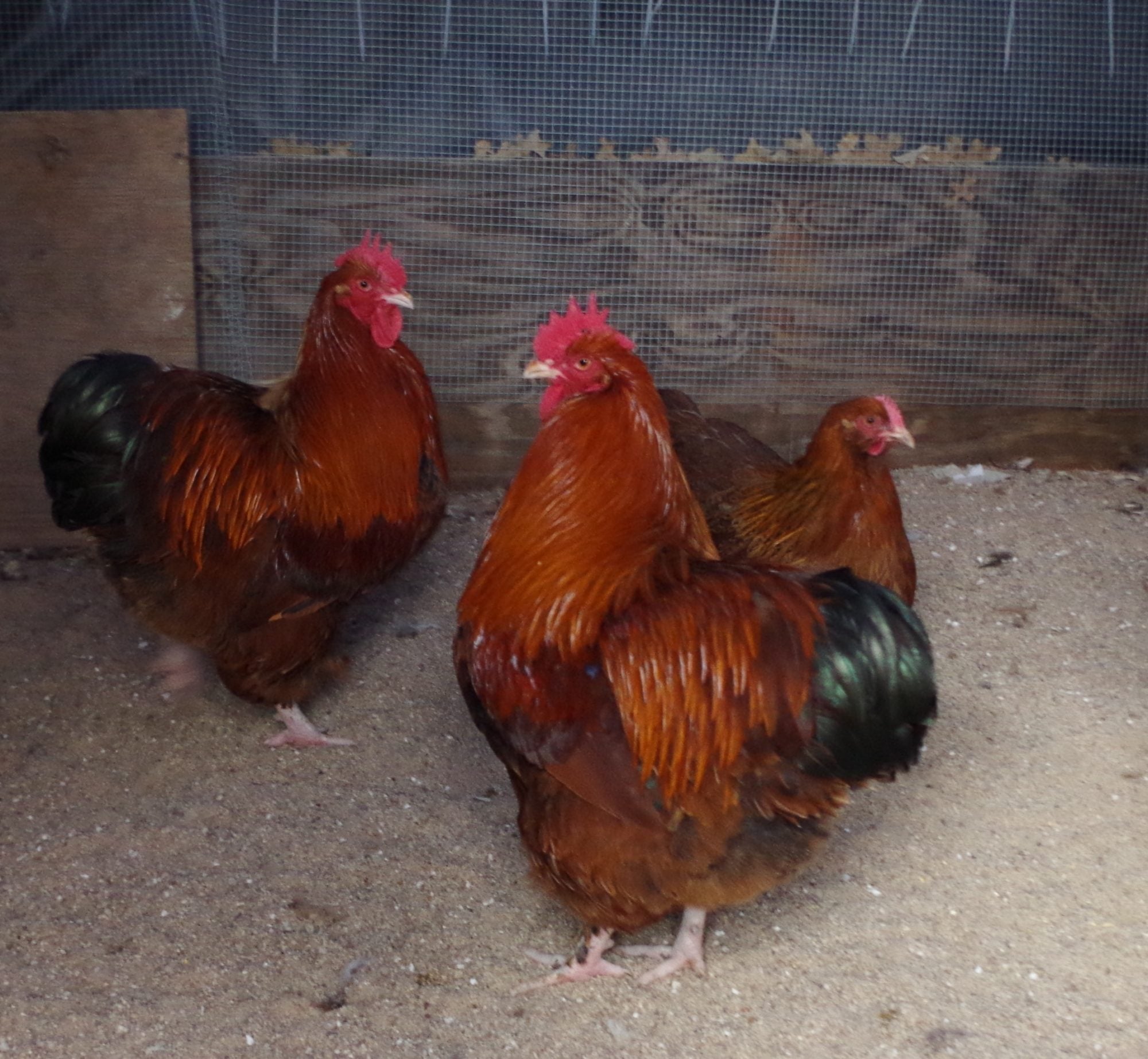 "Redman" and "Sir Wilson" and Jubilee hen in background (In grow out pen - just ready to separate)