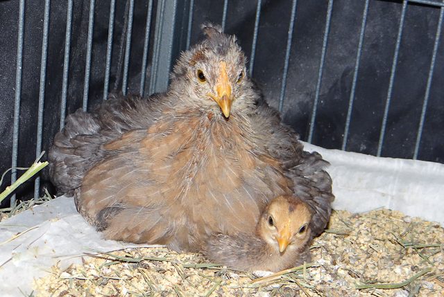 This is my little girl who hatched on Easter. She is now brooding two chicks that are that are three weeks younger than she is! I have posted pictures of her before but this is a new pic from three days ago.