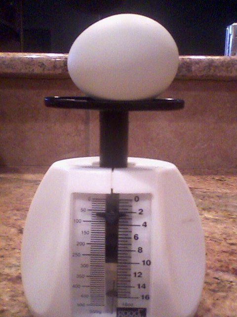 DISCLAIMER: I have a 99 cent diet scale that is pretty old and beat up. It has a lever and is not digital, so reading finer that +/- 2 grams is a challenge. I was at my sister's home two weeks ago and took her some Black Copper Marans Eggs for her kitchen use. I noticed that she had a digital scale so I weighed some of the BCM eggs and from that I think my lever arm diet scale may be a few grams heavy but below are the results I have in my flock book.