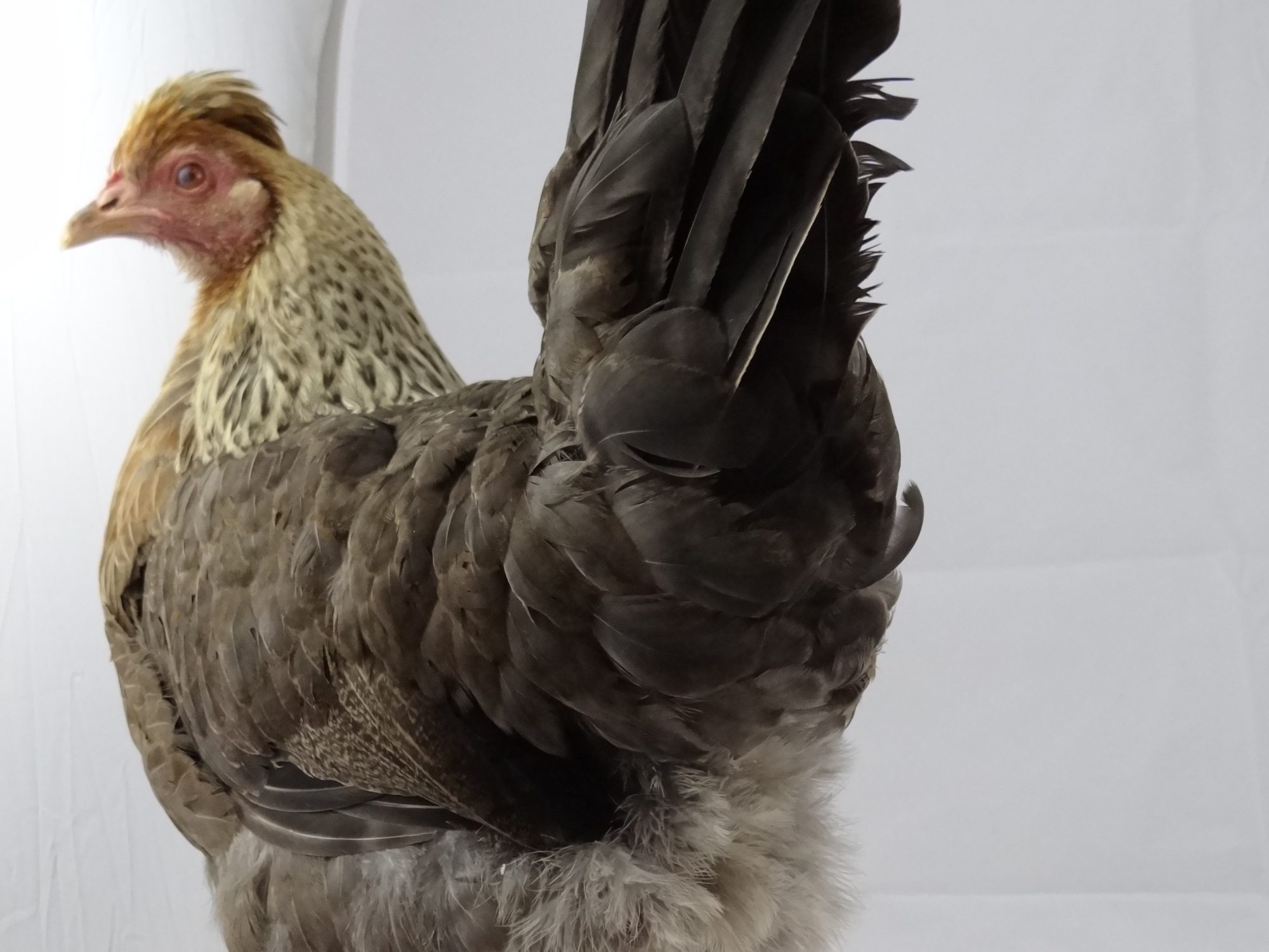 So these are a couple of my F2's from my younger girl who has the cream hackles. One is truly cream and the other and a third not pictured are a very very pale gold. I have 7 others that are in the brooder but no hackles yet to evaluate. I think 3 may be sisters to these and the others are from my older golden girl so I'm interested to see the difference. The older F2 pair from the golden girl has one being just a bit darker and the other a bit more golden (about 20 weeks). Hopefully I'll have at least 2 - 3 cream hackled girls to breed forward next spring waiting to see what turns up to evaluate who will stay on. The entire body of the cream girl is more gray and lacks the brown tinge on the feathers of the more golden girl. The boys are gonna take more time before I can make any cuts but keeping my fingers crossed that I'l have at least one to breed back to his mom to see what turns up. Not worried about floppy combs at this point just basic upright type, hoping for good tails and correct color.