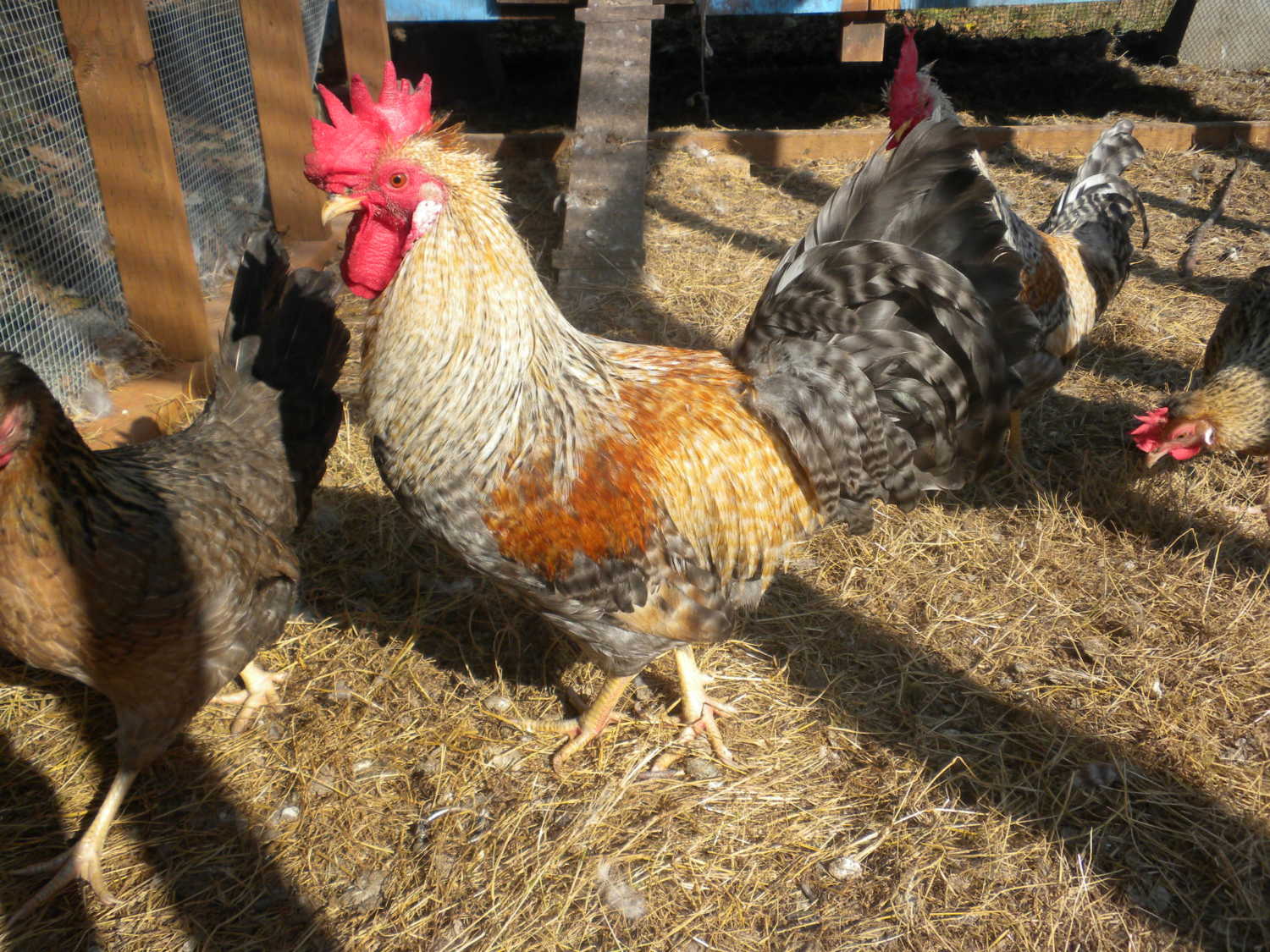 This is Thursday (cream hackles) and Midnight with gold hackles and Arnold the proud father with Jasper (off spring in the back ground.