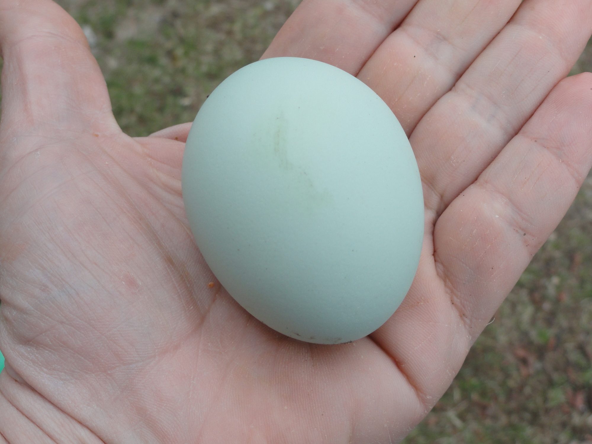 One hen was very small, very dark plumage, and had a stocky body type. She was the most productive of the three hens and layed a very blue egg. She was non-broody. Her eggs never got over about 53 grams before we lost her at about 8-9 months old.
