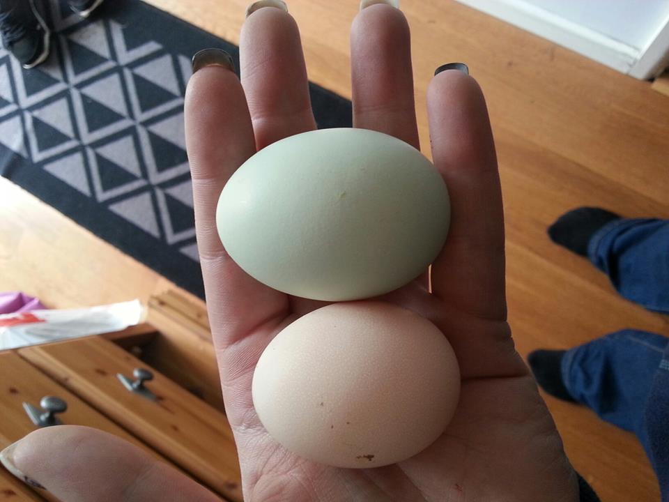 i honestly have no idea, these girls only came to me on sunday (30 weeks old) and these are the first eggs i've been presented with, i do have a plymouth rock in there too but the people that sold me the pair did say the one does lay more whitish eggs, and i'm assuming this lighter one is not from the plymouth as it seems to be on the very small side for an 18 month henSo is brown (egg) a simple recessive gene? And blue is a simple dominant, right? So you'd get 1/4 double-recessive brown, 1/2 blue carrying the brown gene, and 1/4 blue/blue, right? Or no?