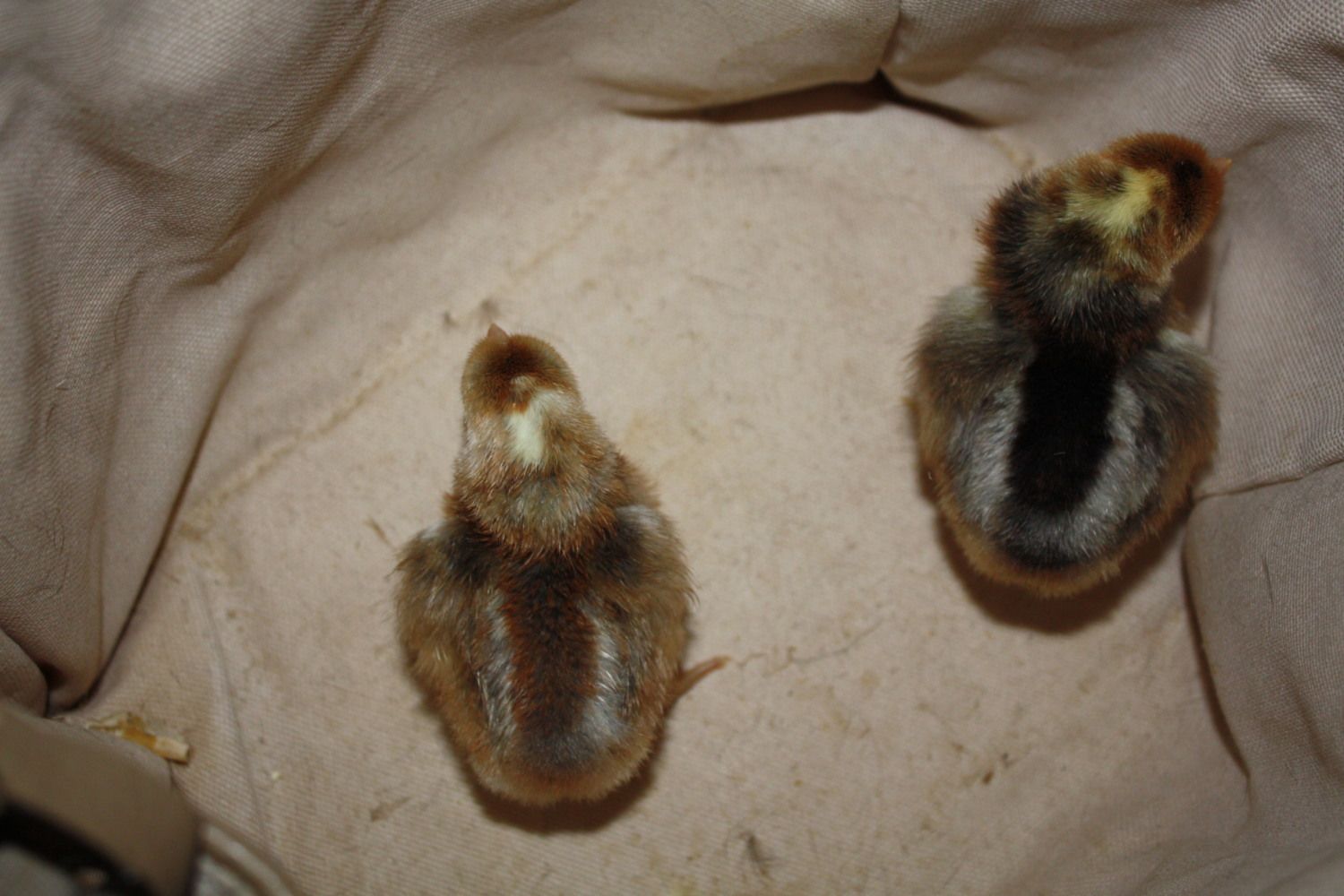 Here are the newest CCL hatchlings. Both are roosters, yeah! I'm keeping them both and growing them out. I'm interested to see what they will look like when grown since one is fairly darker then the other.