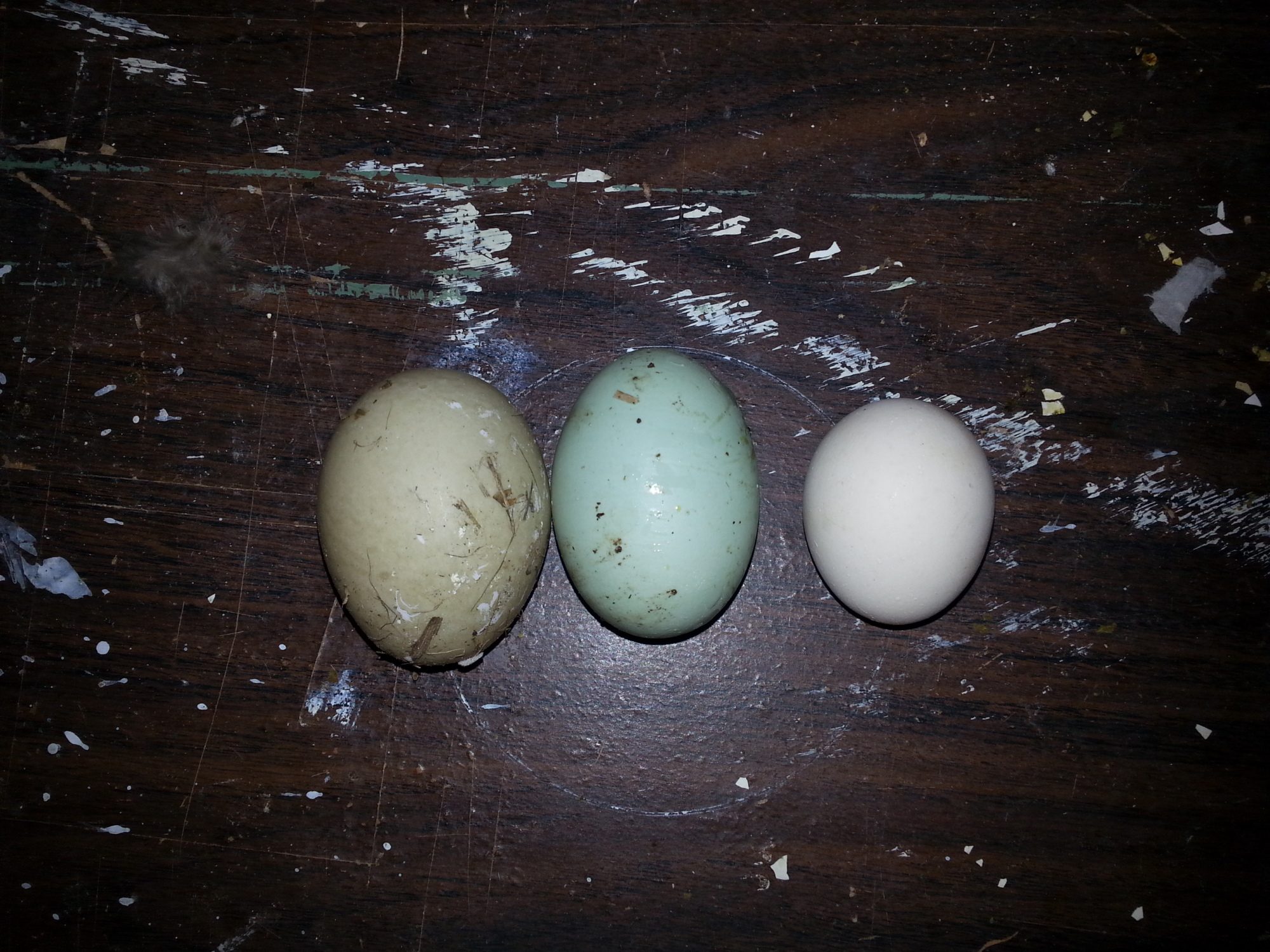 Figured I'd share this pic, from left to right is a muscovy egg, a rose combed legbar egg, and a faverolle egg.