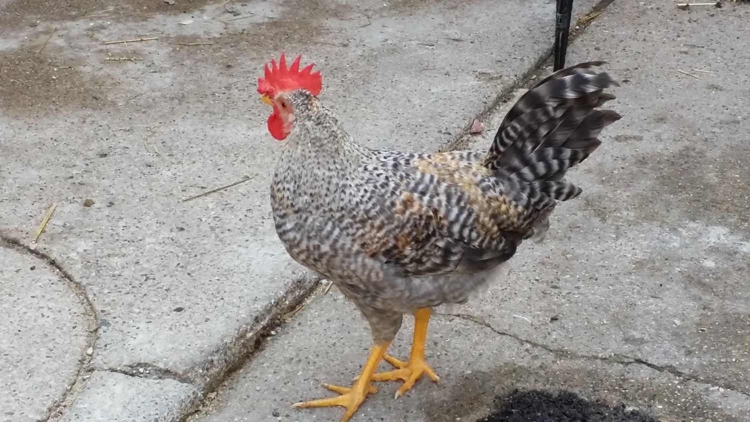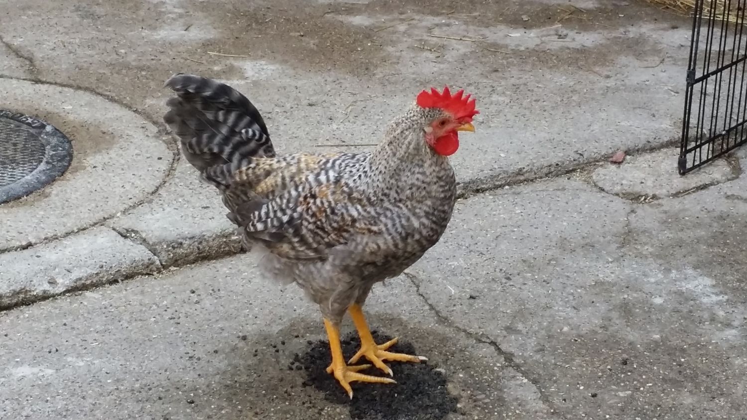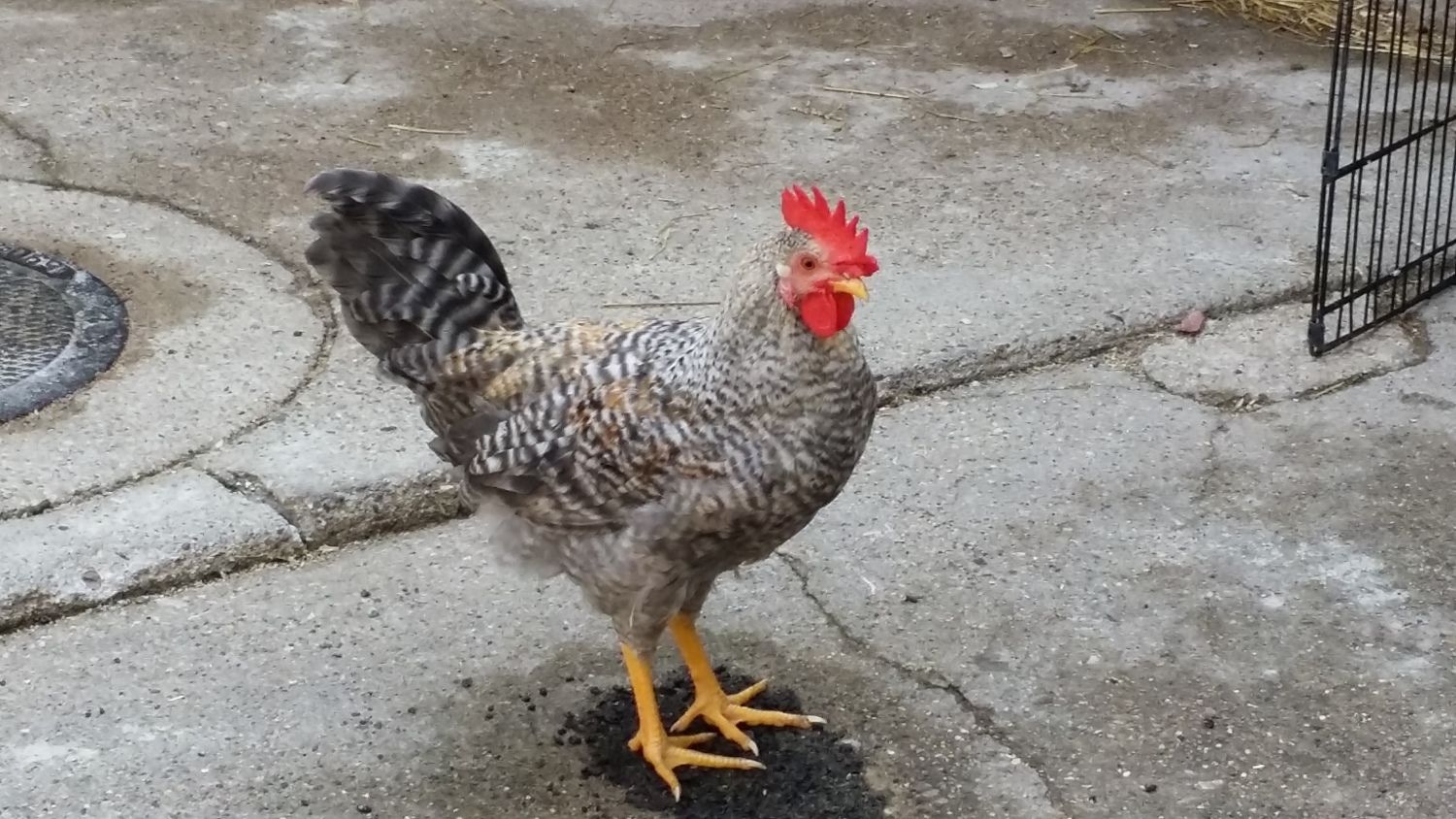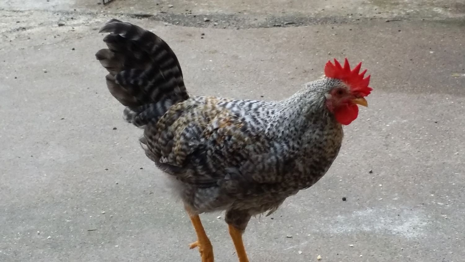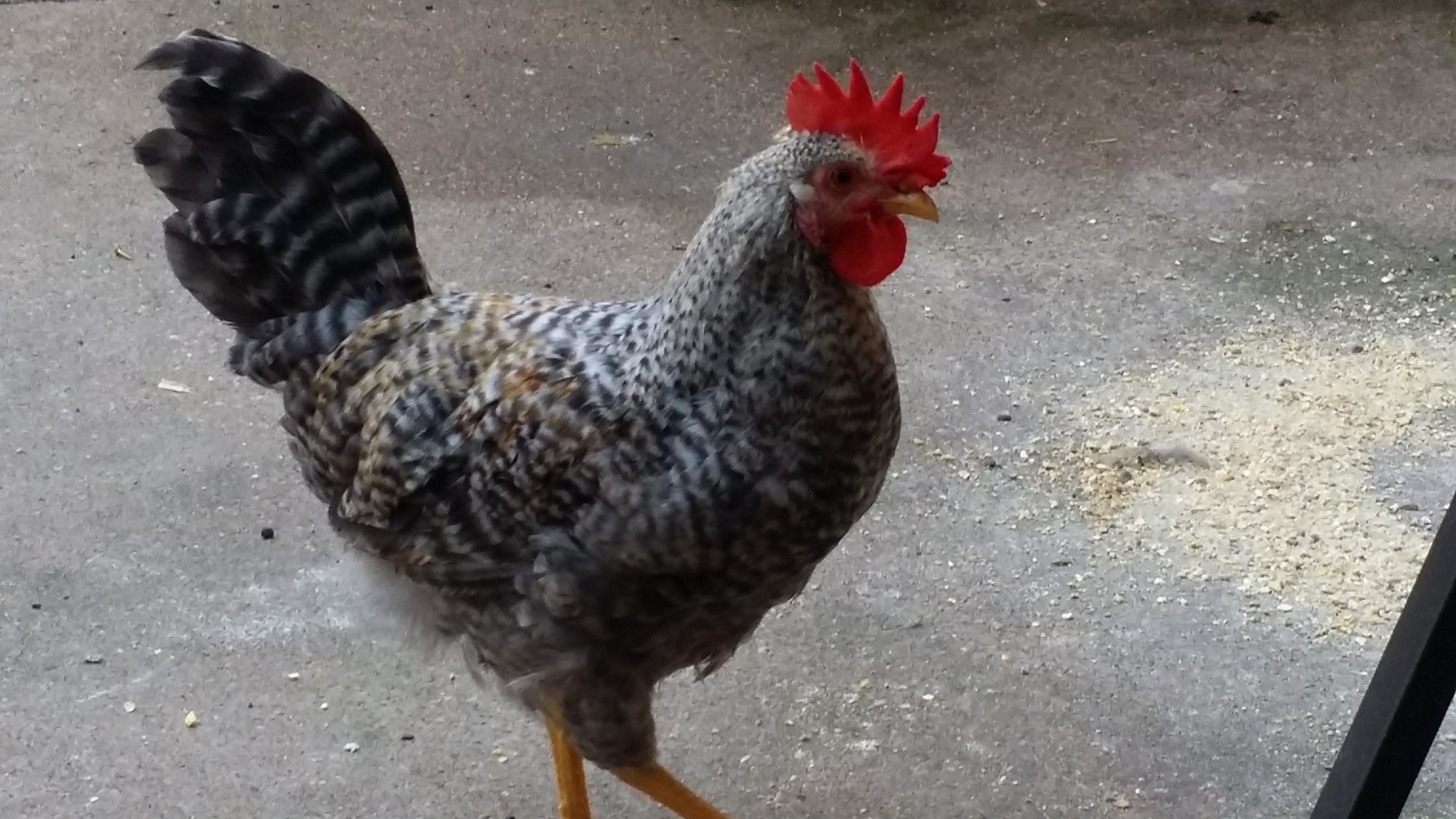 Like an actor on his Mark...how much did you pay him to stand exactly on the dark spot? I really like your cockerel a lot. It looks like he has the desired 6-points on his comb...and wattles are moderate. Nice yellow in legs and beak - and good angle for his tail... Nice, nice rounded line on the breast. How much does he weigh? Corrigan passed 4 pounds last weigh-in - I think that your little guy is even better than Corri - if they were to go head-to-head, beak-to-beak in a poultry show.... Corri is in an awkward stage - he is ALL legs again-- he is the longest legged CL cockerel I have had - and if his legs and feet are like puppies and an indication of his mature size -- he is going to be b-i-g. :O)Since its been quiet for a couple of days. I am posting pictures of my 14 week old cockerel. He is precocious and has been crowing for almost 2 weeks now. How does he look so far? Please feel free to comment, no offense taken in advance. How bad is the twist in the comb in the front? Any chance it will correct as he grows or will it become worse?