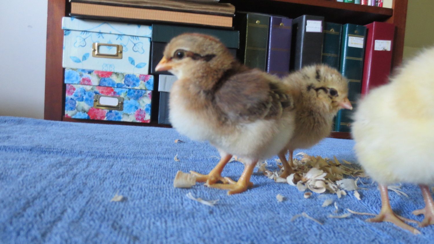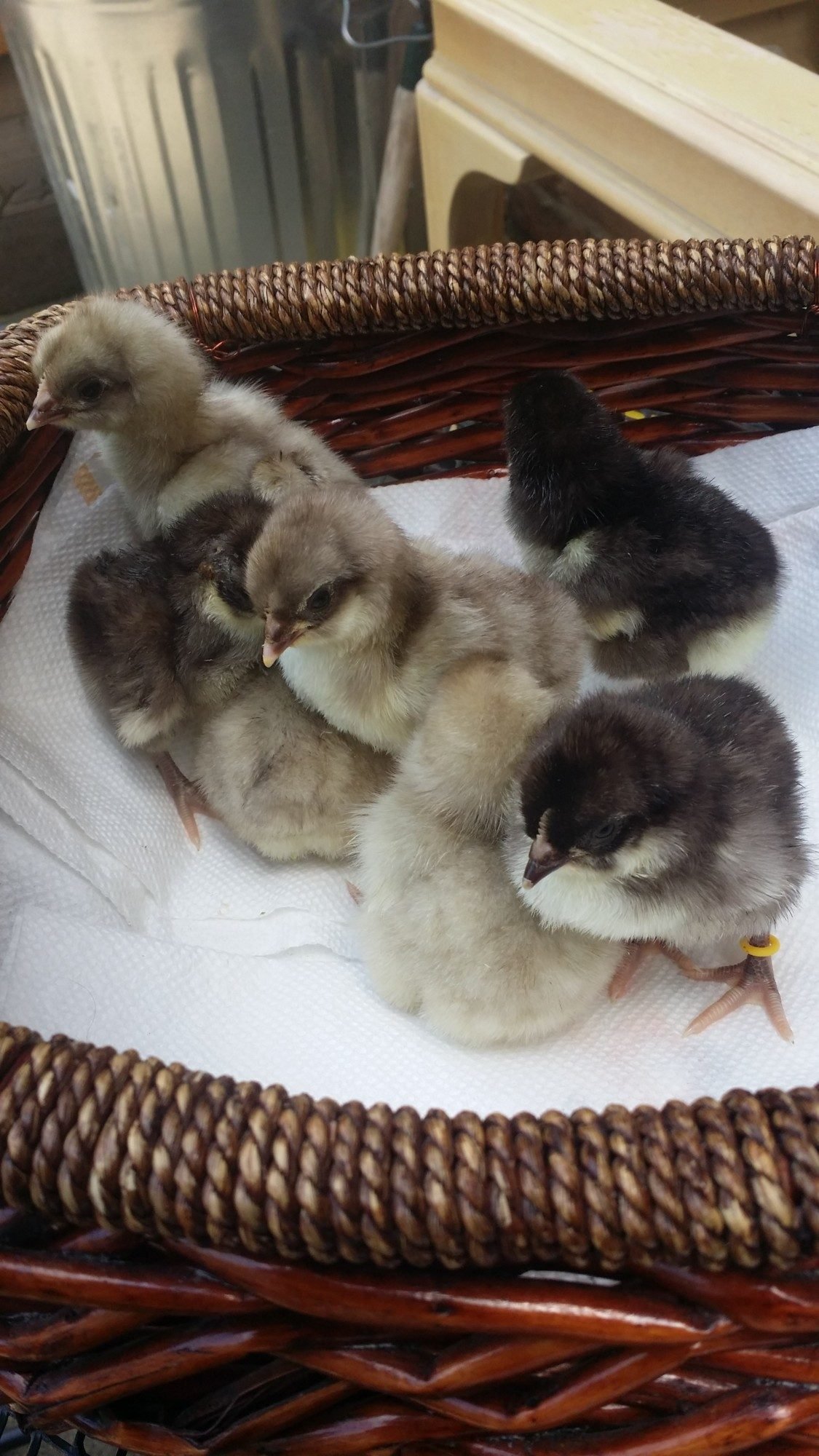 And, I finally got a real legbar chick from the first breeder I went to who accidentally sold me the silver laced Wyandotte mix chick because she thought it was a legbar. Since I already have one dark pullet and one light, I tried to get a middle of the road shade from her. I think this new chick is kind of dark too, though.