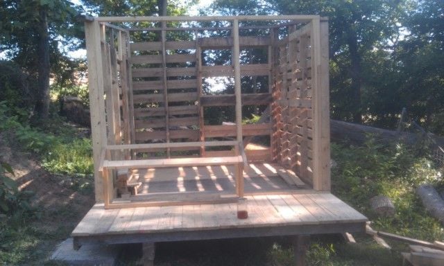 It's 8x8 with a 3 ft porch. Walls are 7 ft in back 6 ft in front. The porch will be covered. I'm putting the nest boxes on the porch for easy access. So far I have around 25 dollars in this. I bought 1 piece of plywood & some nails. The walls are made from pallets & will be covered with a wood type siding. I think I can finish it next weekend if the weather holds out. :-)