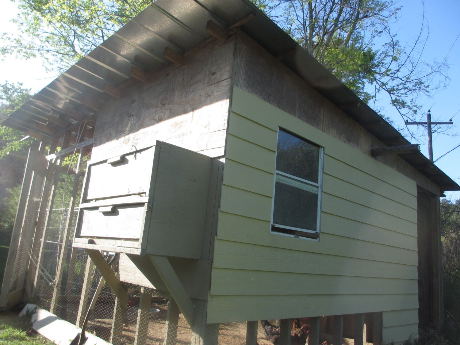 The back side of my coop/run. The glass in the window comes all the way off. Leaving just the wire on the inside. One the real cold days we had this winter,