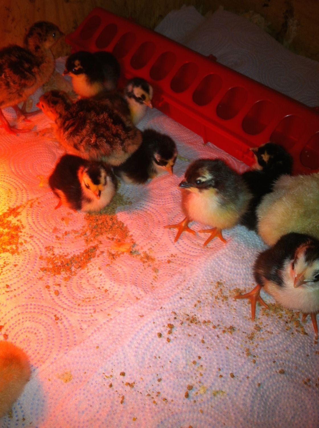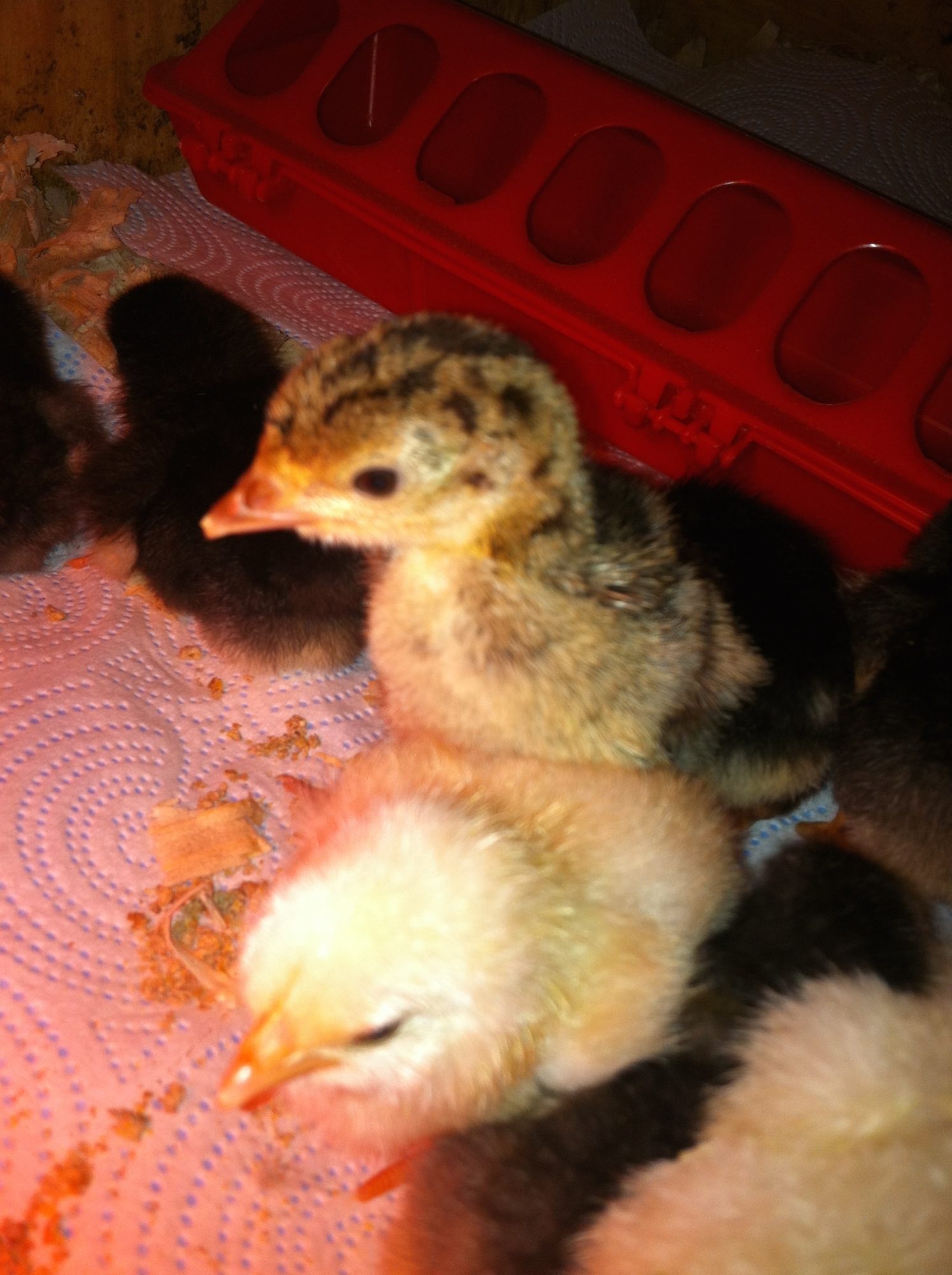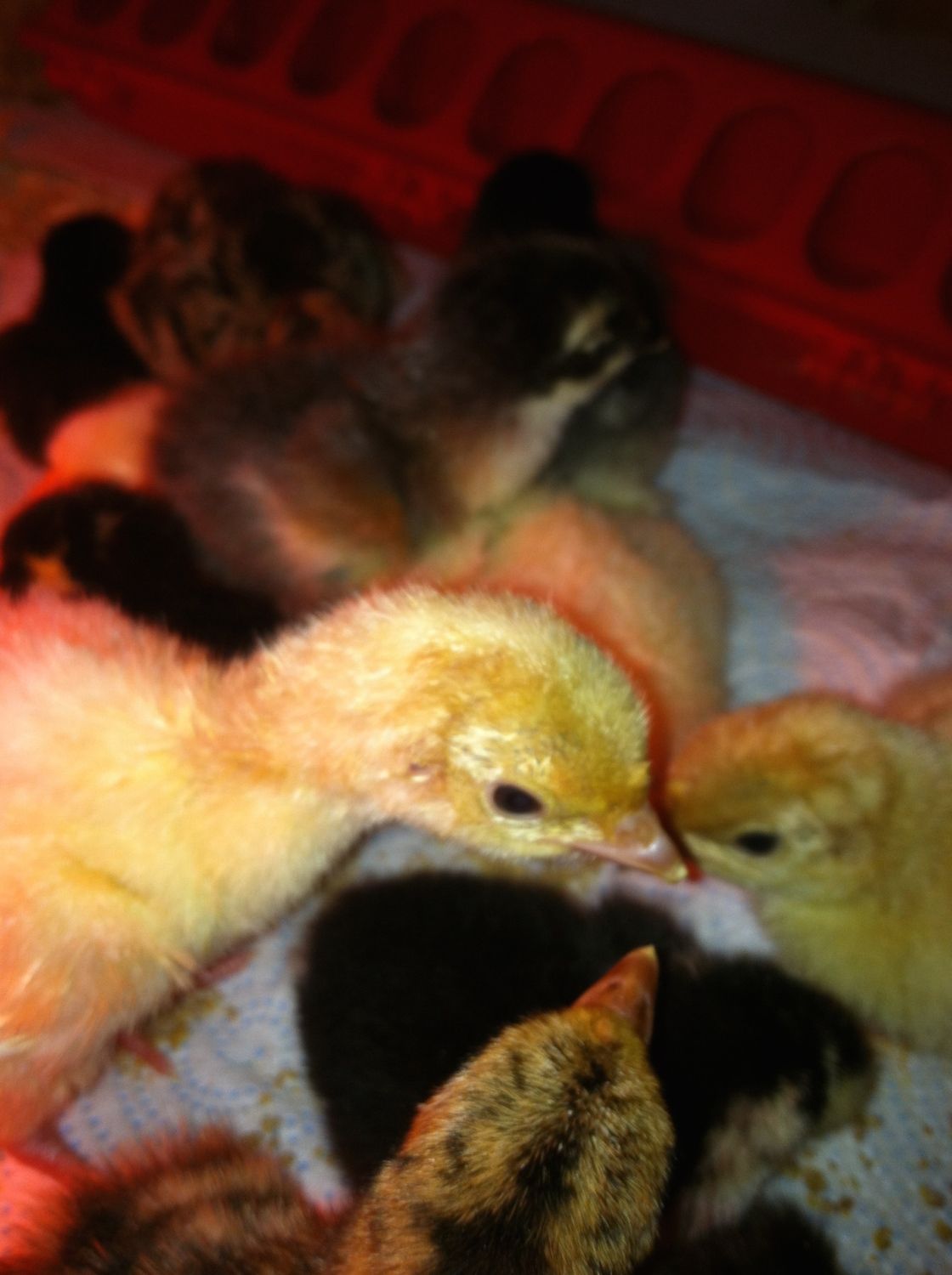Thanks all! I replaced the potentially dangerous bulb with a 60 watt halogen, until I can get the right one....(tomorrow) the room is warm and the bulb is hot, hopefully they will be okay until then! City girl do you have any americauna hatchlings? Or fairly young?