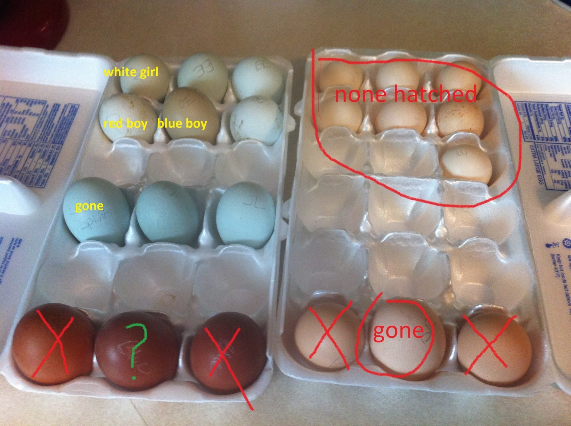The carton on the Left the 3 you have marked would be Olive Eggers (the white prob came from my white Olive Egger hen) the others are EE and could really be any color. The 3 in the Middle would be Lavender splits and would be black with beards and muffs (but so could the EE) . The 3 on the bottom are marans could be blue or black copper, may or may not have feathered legs. The ones in the other carton that didn't hatch are d'Uccles. The brown ones on the bottom? I can't read them![]()