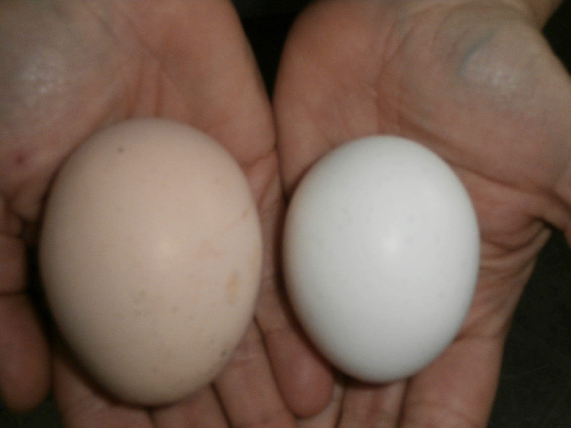Left is Egg laid by Hen on way here yesterday, Right store bought Large white for comparison