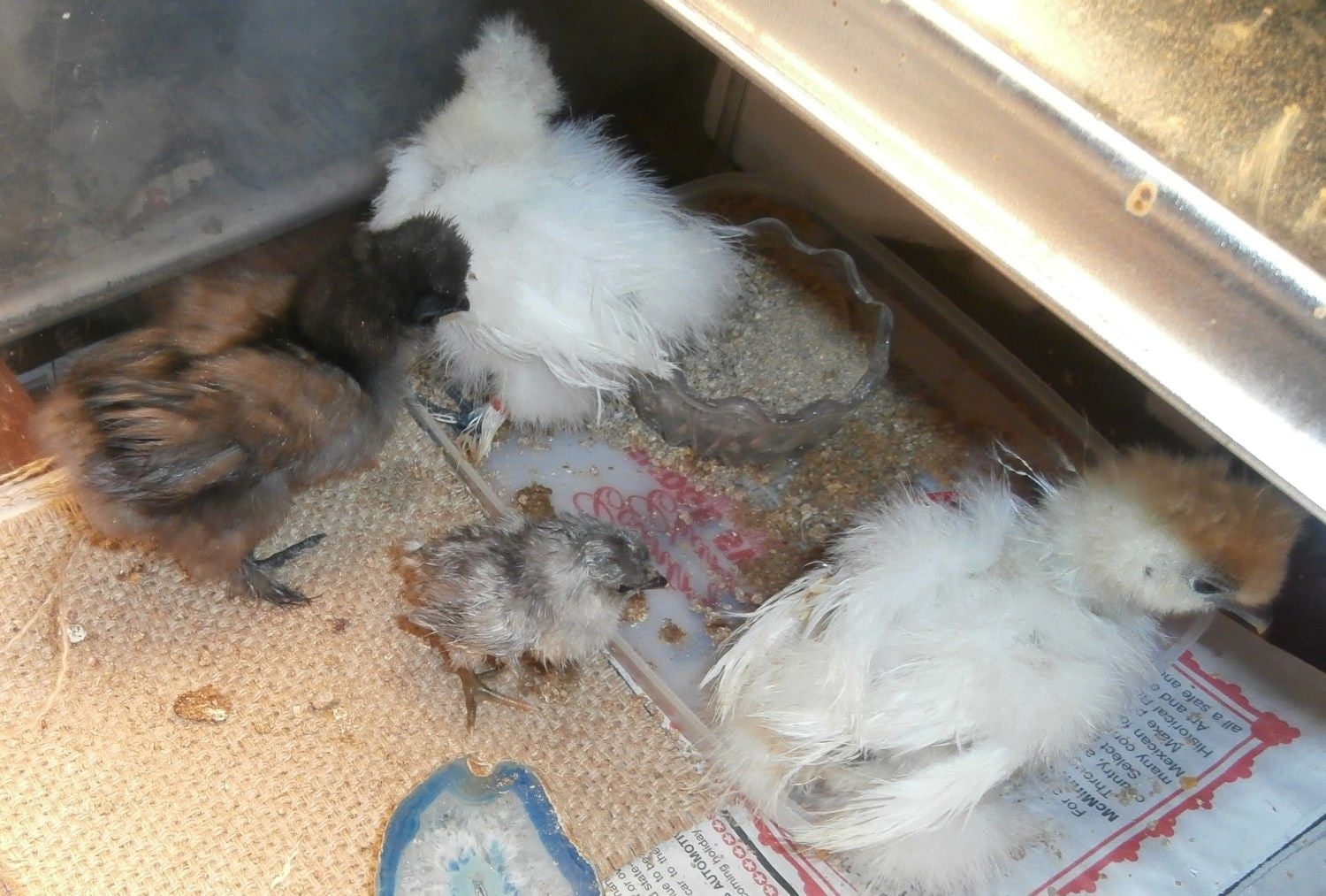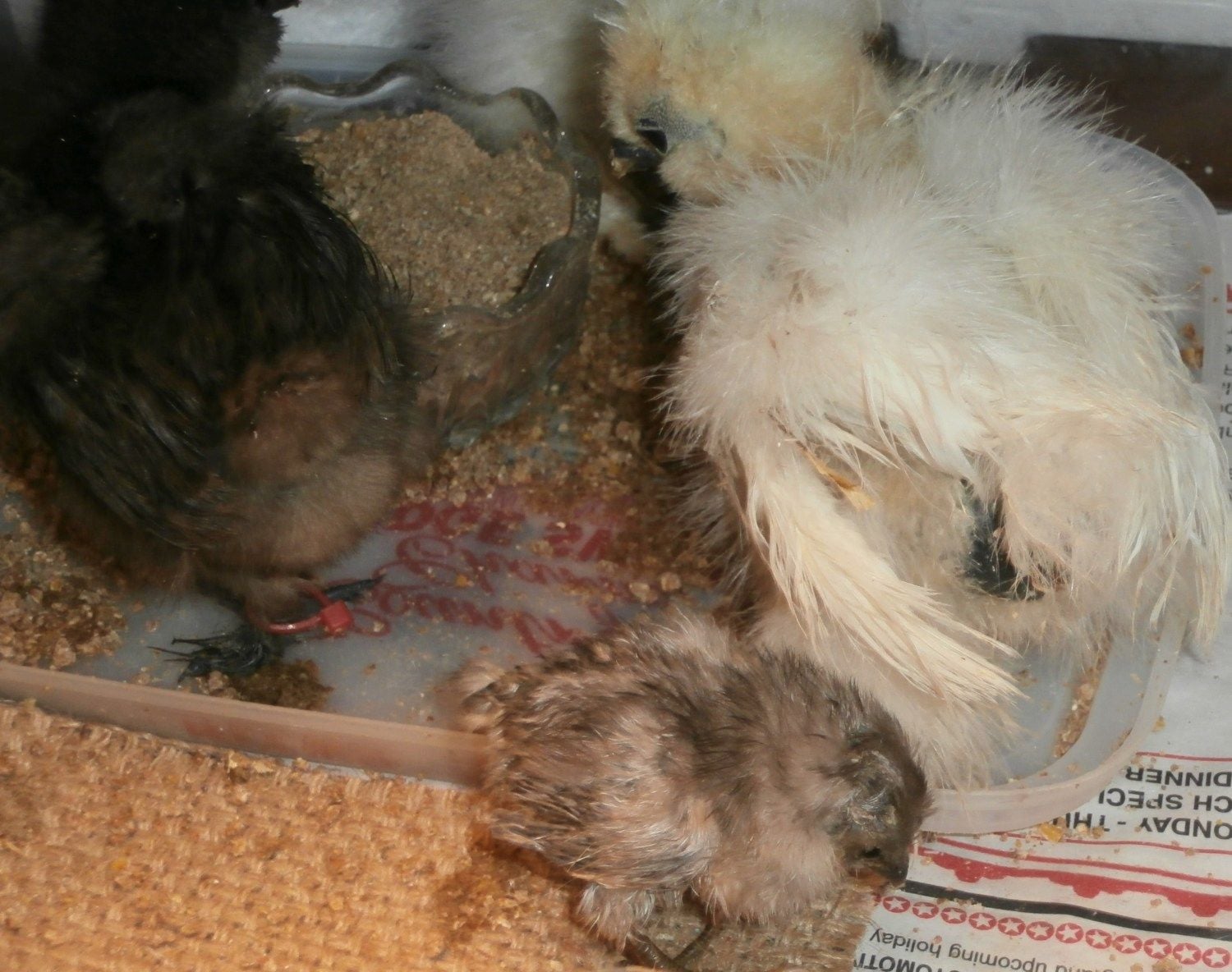 & her 3 new friends, silkie chicks younger than her but look how much bigger!