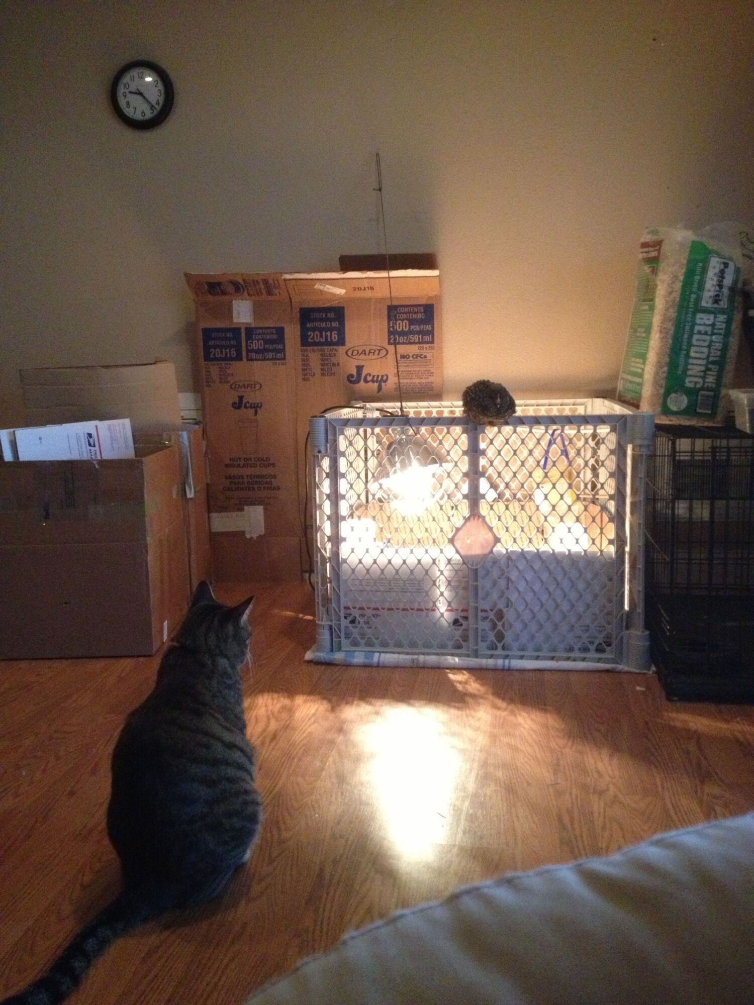 Had a crazy night and had to go to ER. Forgot to put the top on our grow-out brooder in the house. Came home to my cat chick-sitting. When they get out he herds them back in lol. Grabbed a quick snap of him staring down one of our runts roosting on top.